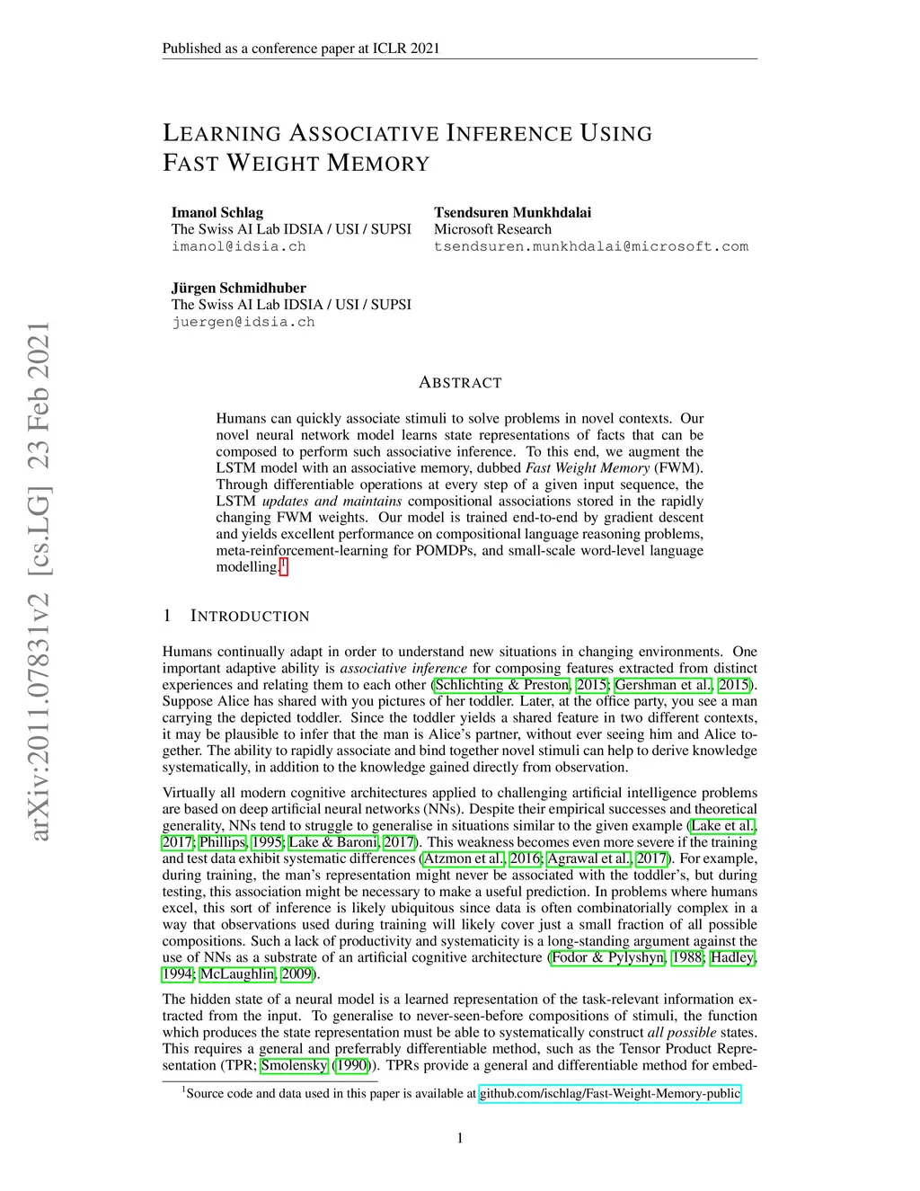Humans can quickly associate stimuli to solve problems in novel contexts. Our novel neural network model learns state representations of facts that can be composed to perform such associative inference. To this end, we augment the LSTM model with an associative memory, dubbed Fast Weight Memory (FWM). Through differentiable operations at every step of a given input sequence, the LSTM updates and maintains compositional associations stored in the rapidly changing FWM weights. Our model is trained end-to-end by gradient descent and yields excellent performance on compositional language reasoning problems, meta-reinforcement-learning for POMDPs, and small-scale word-level language modelling.