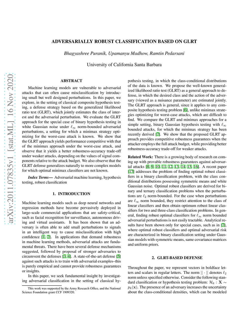 Machine learning models are vulnerable to adversarial attacks that can often cause misclassification by introducing small but well designed perturbations. In this paper, we explore, in the setting of classical composite hypothesis testing, a defense strategy based on the generalized likelihood ratio test (GLRT), which jointly estimates the class of interest and the adversarial perturbation. We evaluate the GLRT approach for the special case of binary hypothesis testing in white Gaussian noise under norm-bounded adversarial perturbations, a setting for which a minimax strategy optimizing for the worst-case attack is known. We show that the GLRT approach yields performance competitive with that of the minimax approach under the worst-case attack, and observe that it yields a better robustness-accuracy trade-off under weaker attacks, depending on the values of signal components relative to the attack budget. We also observe that the GLRT defense generalizes naturally to more complex models for which optimal minimax classifiers are not known.