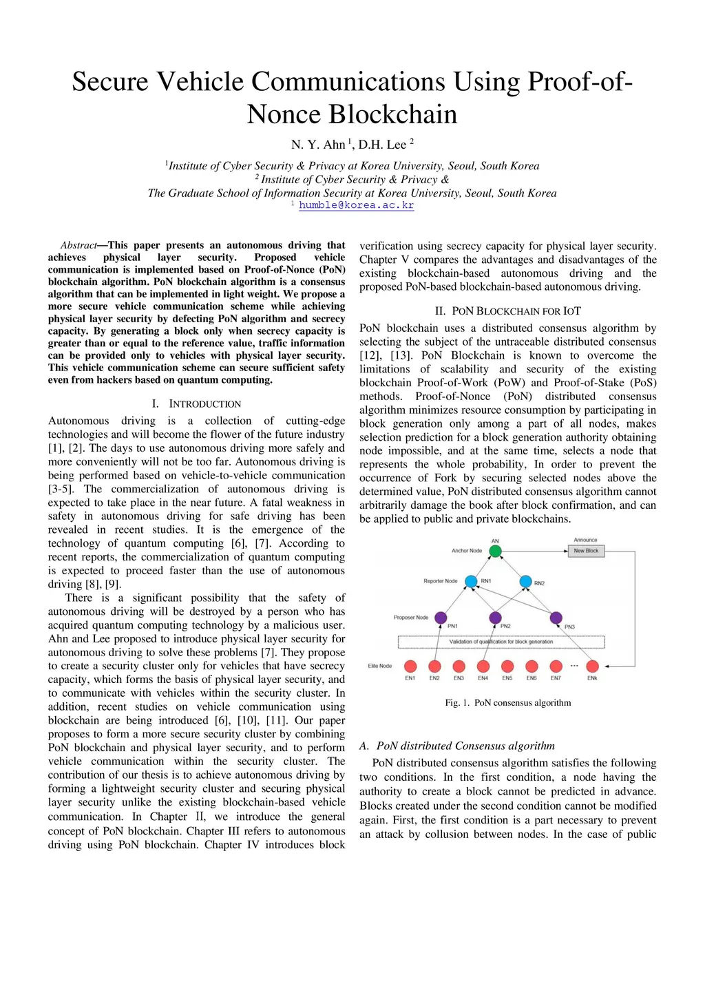 This paper presents an autonomous driving that achieves physical layer security. Proposed vehicle communication is implemented based on Proof-of-Nonce (PoN) blockchain algorithm. PoN blockchain algorithm is a consensus algorithm that can be implemented in light weight. We propose a more secure vehicle communication scheme while achieving physical layer security by defecting PoN algorithm and secrecy capacity. By generating a block only when secrecy capacity is greater than or equal to the reference value, traffic information can be provided only to vehicles with physical layer security. This vehicle communication scheme can secure sufficient safety even from hackers based on quantum computing.