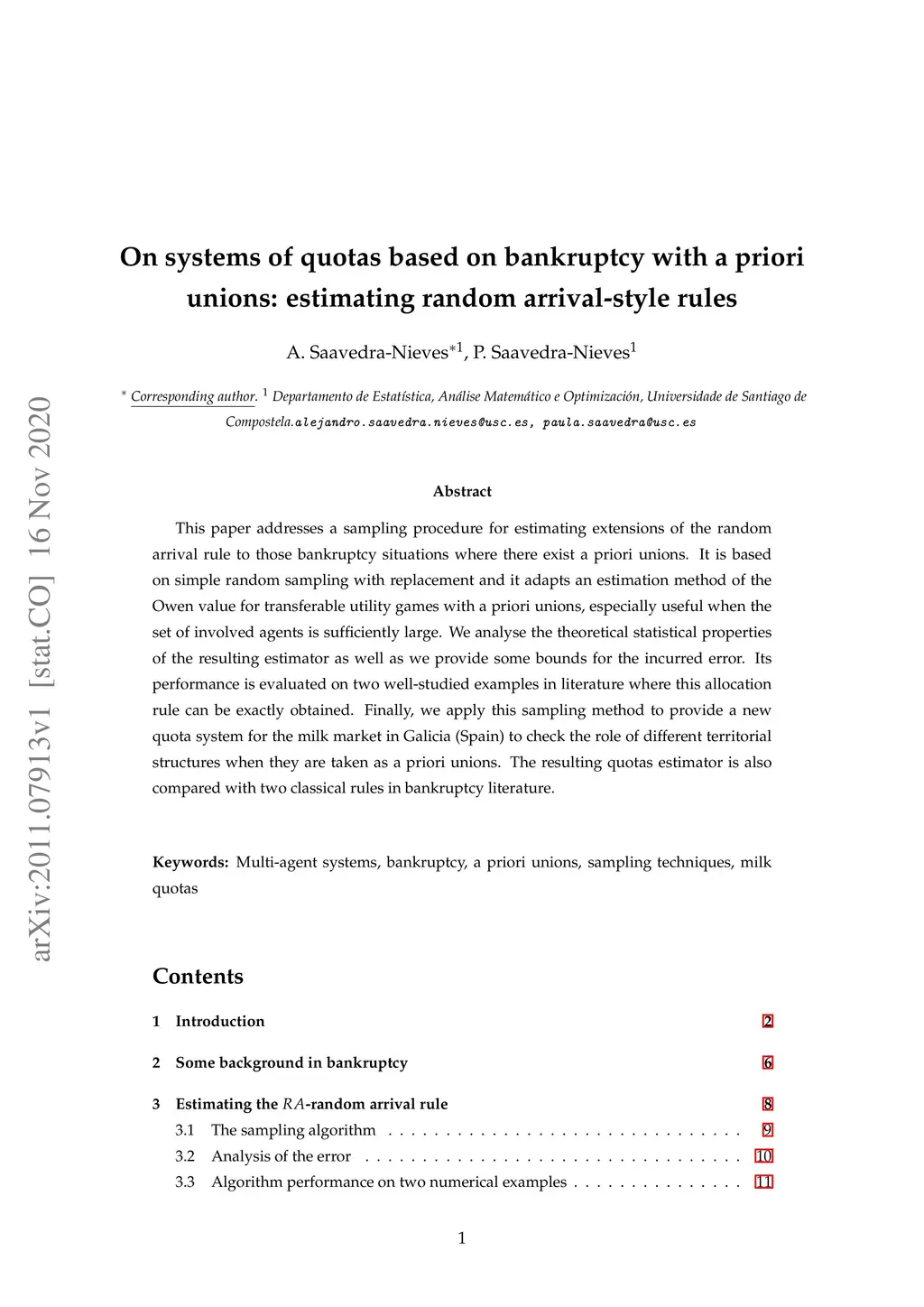 This paper addresses a sampling procedure for estimating extensions of the random arrival rule to those bankruptcy situations where there exist a priori unions. It is based on simple random sampling with replacement and it adapts an estimation method of the Owen value for transferable utility games with a priori unions, especially useful when the set of involved agents is sufficiently large. We analyse the theoretical statistical properties of the resulting estimator as well as we provide some bounds for the incurred error. Its performance is evaluated on two well-studied examples in literature where this allocation rule can be exactly obtained. Finally, we apply this sampling method to provide a new quota system for the milk market in Galicia (Spain) to check the role of different territorial structures when they are taken as a priori unions. The resulting quotas estimator is also compared with two classical rules in bankruptcy literature.