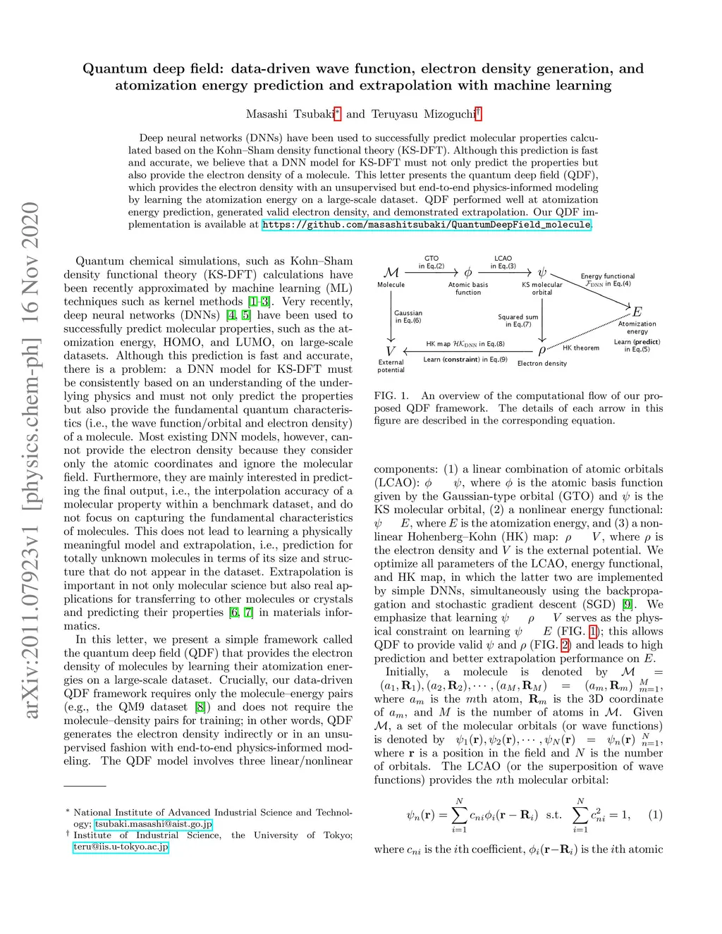 Deep neural networks (DNNs) have been used to successfully predict molecular properties calculated based on the Kohn--Sham density functional theory (KS-DFT). Although this prediction is fast and accurate, we believe that a DNN model for KS-DFT must not only predict the properties but also provide the electron density of a molecule. This letter presents the quantum deep field (QDF), which provides the electron density with an unsupervised but end-to-end physics-informed modeling by learning the atomization energy on a large-scale dataset. QDF performed well at atomization energy prediction, generated valid electron density, and demonstrated extrapolation. Our QDF implementation is available at https://github.com/masashitsubaki/QuantumDeepField_molecule.