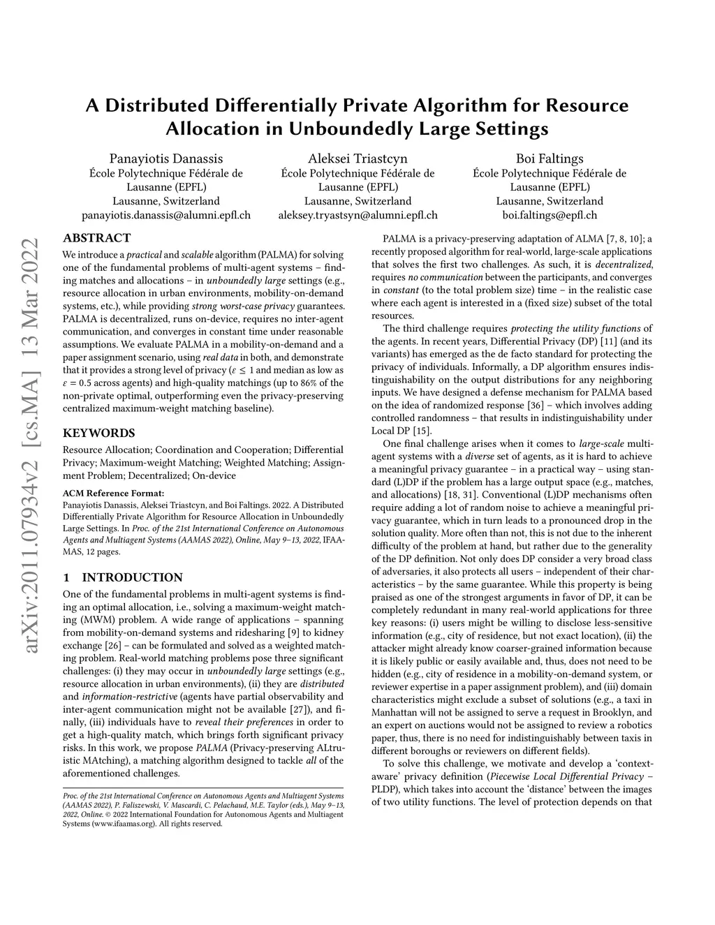 We introduce a practical and scalable algorithm (PALMA) for solving one of the fundamental problems of multi-agent systems -- finding matches and allocations -- in unboundedly large settings (e.g., resource allocation in urban environments, mobility-on-demand systems, etc.), while providing strong worst-case privacy guarantees. PALMA is decentralized, runs on-device, requires no inter-agent communication, and converges in constant time under reasonable assumptions. We evaluate PALMA in a mobility-on-demand and a paper assignment scenario, using real data in both, and demonstrate that it provides a strong level of privacy ( and median as low as across agents) and high-quality matchings (up to of the non-private optimal, outperforming even the privacy-preserving centralized maximum-weight matching baseline).