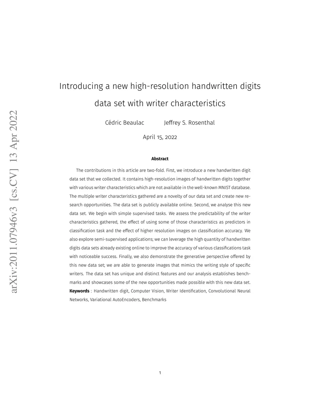The contributions in this article are two-fold. First, we introduce a new hand-written digit data set that we collected. It contains high-resolution images of hand-written The contributions in this article are two-fold. First, we introduce a new handwritten digit data set that we collected. It contains high-resolution images of handwritten digits together with various writer characteristics which are not available in the well-known MNIST database. The multiple writer characteristics gathered are a novelty of our data set and create new research opportunities. The data set is publicly available online. Second, we analyse this new data set. We begin with simple supervised tasks. We assess the predictability of the writer characteristics gathered, the effect of using some of those characteristics as predictors in classification task and the effect of higher resolution images on classification accuracy. We also explore semi-supervised applications; we can leverage the high quantity of handwritten digits data sets already existing online to improve the accuracy of various classifications task with noticeable success. Finally, we also demonstrate the generative perspective offered by this new data set; we are able to generate images that mimics the writing style of specific writers. The data set has unique and distinct features and our analysis establishes benchmarks and showcases some of the new opportunities made possible with this new data set.
