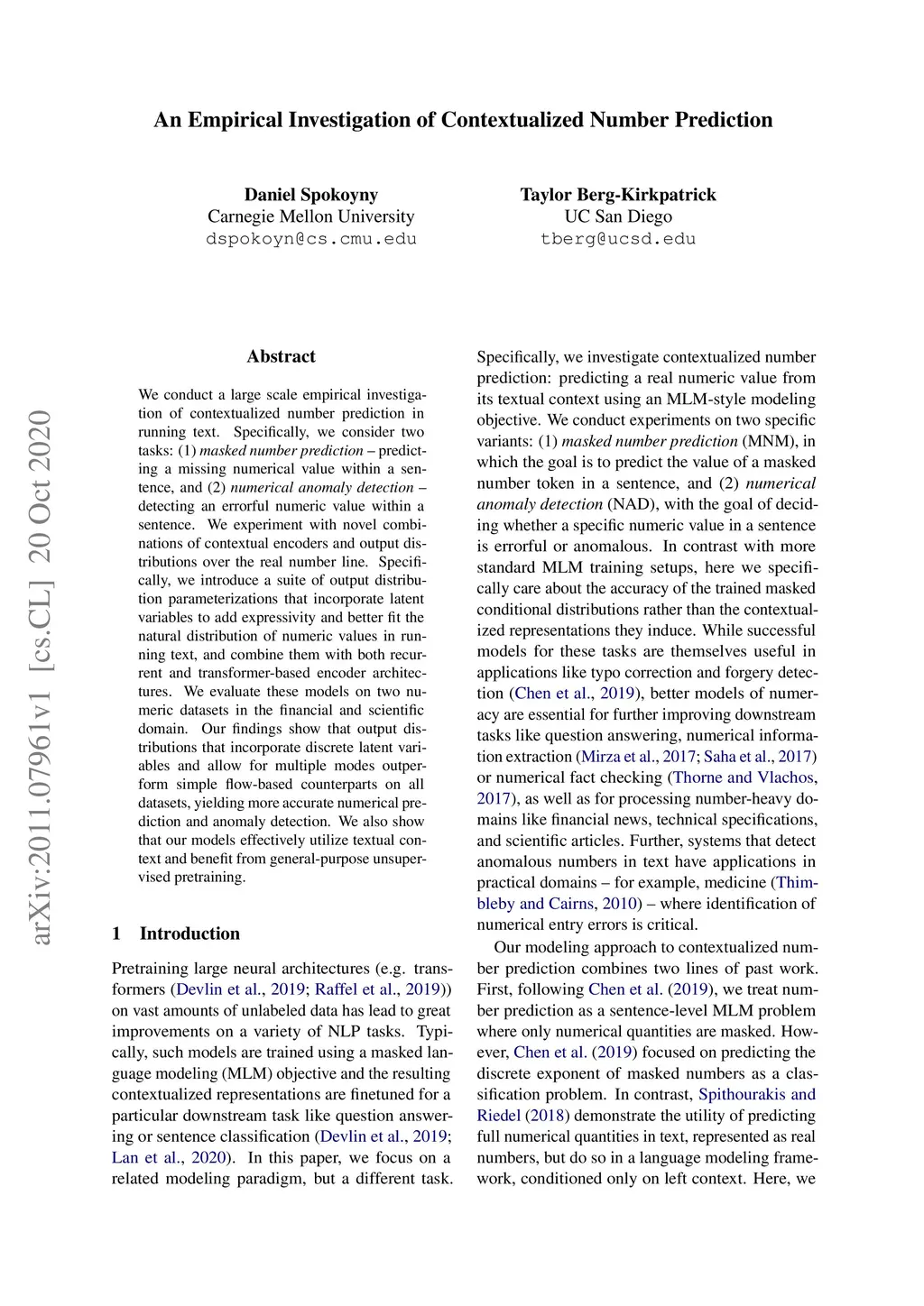 We conduct a large scale empirical investigation of contextualized number prediction in running text. Specifically, we consider two tasks: (1)masked number prediction-predicting a missing numerical value within a sentence, and (2)numerical anomaly detection-detecting an errorful numeric value within a sentence. We experiment with novel combinations of contextual encoders and output distributions over the real number line. Specifically, we introduce a suite of output distribution parameterizations that incorporate latent variables to add expressivity and better fit the natural distribution of numeric values in running text, and combine them with both recurrent and transformer-based encoder architectures. We evaluate these models on two numeric datasets in the financial and scientific domain. Our findings show that output distributions that incorporate discrete latent variables and allow for multiple modes outperform simple flow-based counterparts on all datasets, yielding more accurate numerical prediction and anomaly detection. We also show that our models effectively utilize textual con-text and benefit from general-purpose unsupervised pretraining.