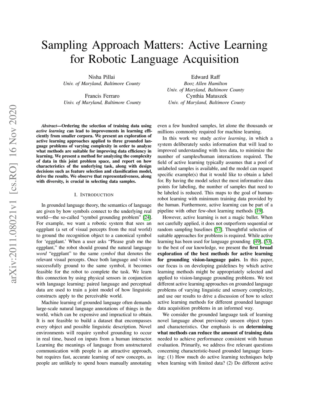 Ordering the selection of training data using active learning can lead to improvements in learning efficiently from smaller corpora. We present an exploration of active learning approaches applied to three grounded language problems of varying complexity in order to analyze what methods are suitable for improving data efficiency in learning. We present a method for analyzing the complexity of data in this joint problem space, and report on how characteristics of the underlying task, along with design decisions such as feature selection and classification model, drive the results. We observe that representativeness, along with diversity, is crucial in selecting data samples.