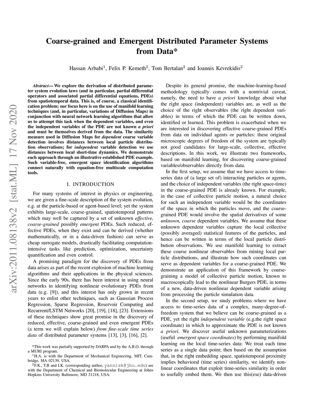 We explore the derivation of distributed parameter system evolution laws (and in particular, partial differential operators and associated partial differential equations, PDEs) from spatiotemporal data. This is, of course, a classical identification problem; our focus here is on the use of manifold learning techniques (and, in particular, variations of Diffusion Maps) in conjunction with neural network learning algorithms that allow us to attempt this task when the dependent variables, and even the independent variables of the PDE are not known a priori and must be themselves derived from the data. The similarity measure used in Diffusion Maps for dependent coarse variable detection involves distances between local particle distribution observations; for independent variable detection we use distances between local short-time dynamics. We demonstrate each approach through an illustrative established PDE example. Such variable-free, emergent space identification algorithms connect naturally with equation-free multiscale computation tools.