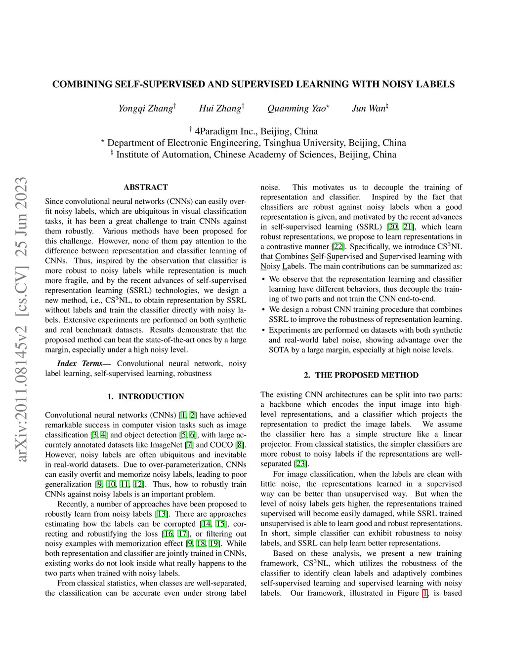 Since convolutional neural networks (CNNs) can easily overfit noisy labels, which are ubiquitous in visual classification tasks, it has been a great challenge to train CNNs against them robustly. Various methods have been proposed for this challenge. However, none of them pay attention to the difference between representation and classifier learning of CNNs. Thus, inspired by the observation that classifier is more robust to noisy labels while representation is much more fragile, and by the recent advances of self-supervised representation learning (SSRL) technologies, we design a new method, i.e., CSNL, to obtain representation by SSRL without labels and train the classifier directly with noisy labels. Extensive experiments are performed on both synthetic and real benchmark datasets. Results demonstrate that the proposed method can beat the state-of-the-art ones by a large margin, especially under a high noisy level.