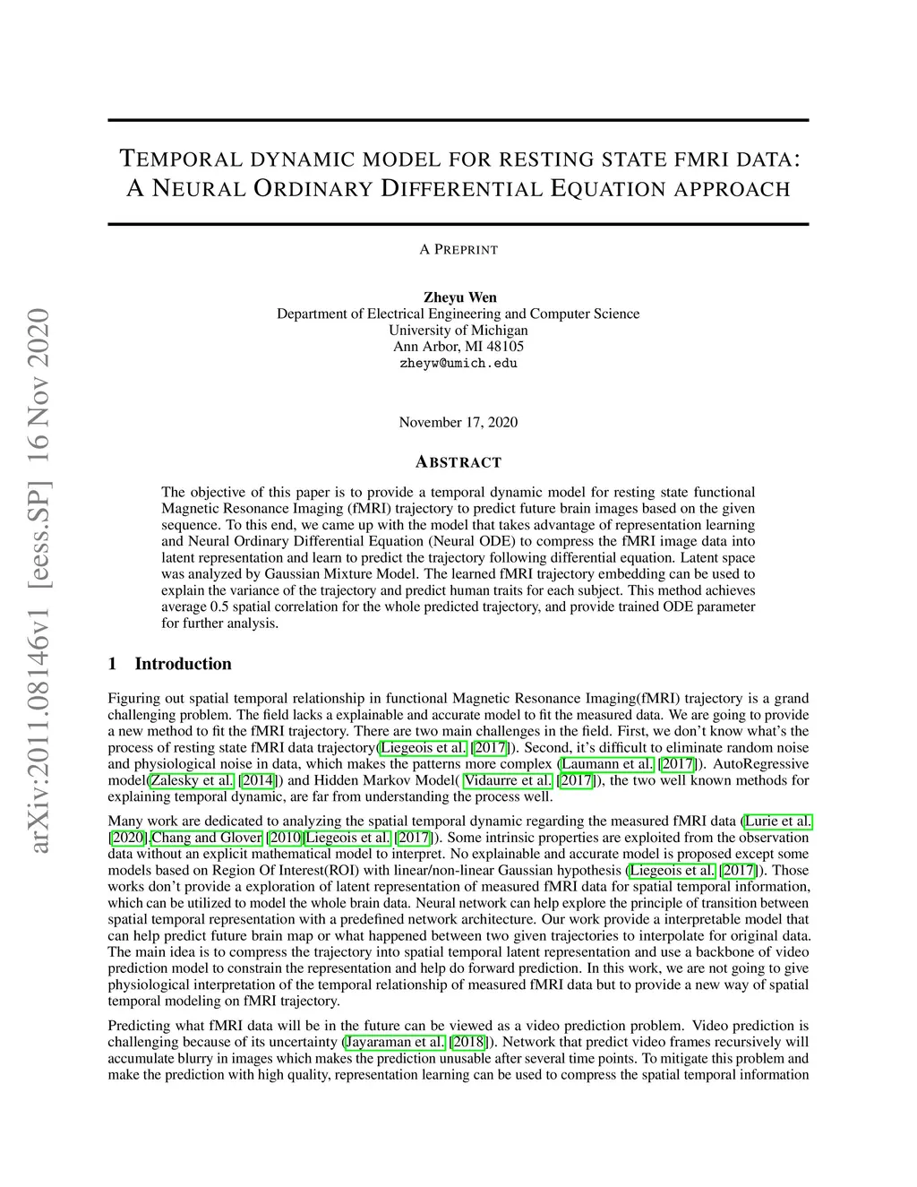 The objective of this paper is to provide a temporal dynamic model for resting state functional Magnetic Resonance Imaging (fMRI) trajectory to predict future brain images based on the given sequence. To this end, we came up with the model that takes advantage of representation learning and Neural Ordinary Differential Equation (Neural ODE) to compress the fMRI image data into latent representation and learn to predict the trajectory following differential equation. Latent space was analyzed by Gaussian Mixture Model. The learned fMRI trajectory embedding can be used to explain the variance of the trajectory and predict human traits for each subject. This method achieves average 0.5 spatial correlation for the whole predicted trajectory, and provide trained ODE parameter for further analysis.