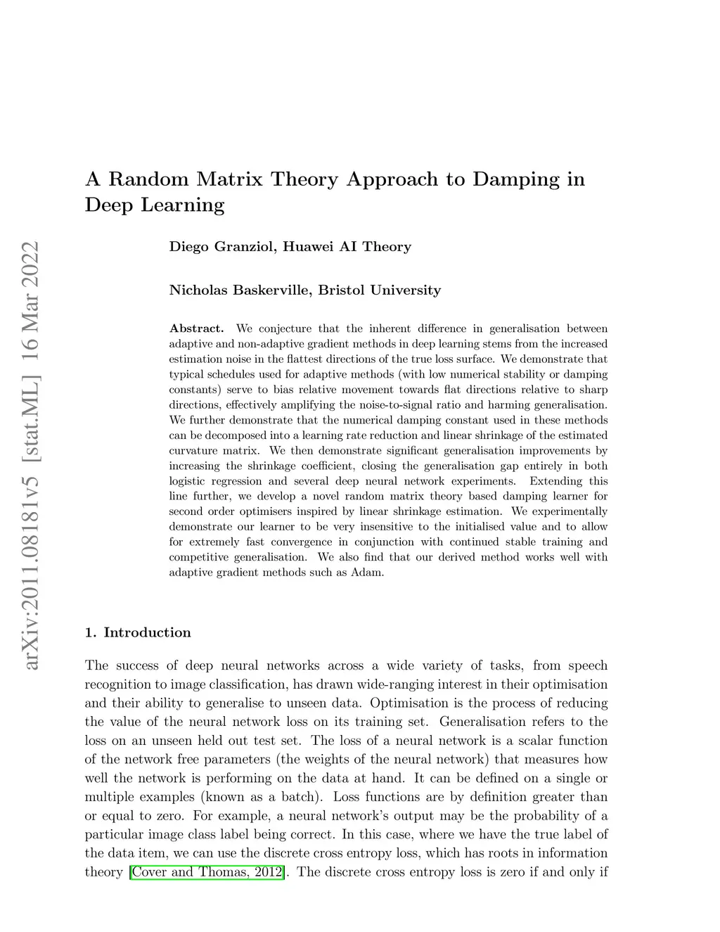 We conjecture that the inherent difference in generalisation between adaptive and non-adaptive gradient methods in deep learning stems from the increased estimation noise in the flattest directions of the true loss surface. We demonstrate that typical schedules used for adaptive methods (with low numerical stability or damping constants) serve to bias relative movement towards flat directions relative to sharp directions, effectively amplifying the noise-to-signal ratio and harming generalisation. We further demonstrate that the numerical damping constant used in these methods can be decomposed into a learning rate reduction and linear shrinkage of the estimated curvature matrix. We then demonstrate significant generalisation improvements by increasing the shrinkage coefficient, closing the generalisation gap entirely in both logistic regression and several deep neural network experiments. Extending this line further, we develop a novel random matrix theory based damping learner for second order optimiser inspired by linear shrinkage estimation. We experimentally demonstrate our learner to be very insensitive to the initialised value and to allow for extremely fast convergence in conjunction with continued stable training and competitive generalisation.