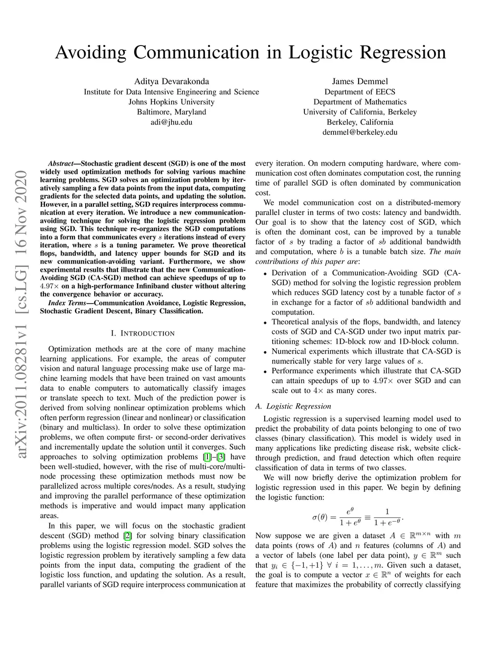 Stochastic gradient descent (SGD) is one of the most widely used optimization methods for solving various machine learning problems. SGD solves an optimization problem by iteratively sampling a few data points from the input data, computing gradients for the selected data points, and updating the solution. However, in a parallel setting, SGD requires interprocess communication at every iteration. We introduce a new communication-avoiding technique for solving the logistic regression problem using SGD. This technique re-organizes the SGD computations into a form that communicates every iterations instead of every iteration, where is a tuning parameter. We prove theoretical flops, bandwidth, and latency upper bounds for SGD and its new communication-avoiding variant. Furthermore, we show experimental results that illustrate that the new Communication-Avoiding SGD (CA-SGD) method can achieve speedups of up to on a high-performance Infiniband cluster without altering the convergence behavior or accuracy.