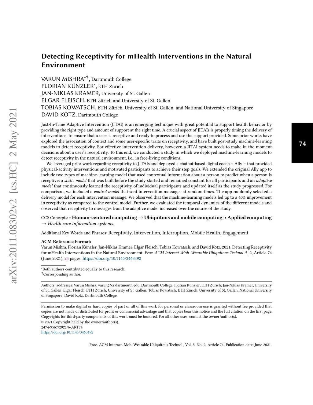 JITAI is an emerging technique with great potential to support health behavior by providing the right type and amount of support at the right time. A crucial aspect of JITAIs is properly timing the delivery of interventions, to ensure that a user is receptive and ready to process and use the support provided. Some prior works have explored the association of context and some user-specific traits on receptivity, and have built post-study machine-learning models to detect receptivity. For effective intervention delivery, however, a JITAI system needs to make in-the-moment decisions about a user's receptivity. To this end, we conducted a study in which we deployed machine-learning models to detect receptivity in the natural environment, i.e., in free-living conditions. We leveraged prior work regarding receptivity to JITAIs and deployed a chatbot-based digital coach~-- Ally~-- that provided physical-activity interventions and motivated participants to achieve their step goals. We extended the original Ally~app to include two types of machine-learning model that used contextual information about a person to predict when a person is receptive: a \textit{static model\/} that was built before the study started and remained constant for all participants and an \textit{adaptive model\/} that continuously learned the receptivity of individual participants and updated itself as the study progressed. For comparison, we included a \textit{control model\/} that sent intervention messages at random times. The app randomly selected a delivery model for each intervention message. We observed that the machine-learning models led up to a 40\% improvement in receptivity as compared to the control model. Further, we evaluated the temporal dynamics of the different models and observed that receptivity to messages from the adaptive model increased over the course of the study.