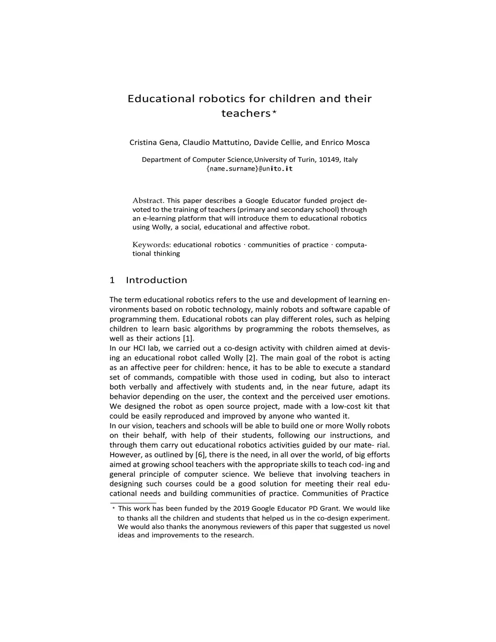 This paper describes a Google Educator funded project devoted to the training of teachers (primary and secondary school) through an e-learning platform that will introduce them to educational robotics using Wolly, a social, educational and affective robot.