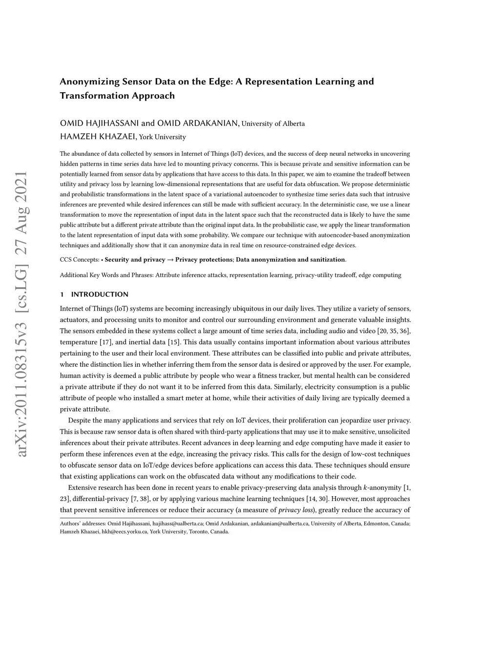 Anonymizing Sensor Data on the Edge: A Representation Learning and