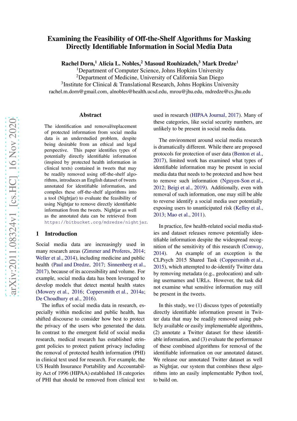 The identification and removal/replacement of protected information from social media data is an understudied problem, despite being desirable from an ethical and legal perspective. This paper identifies types of potentially directly identifiable information (inspired by protected health information in clinical texts) contained in tweets that may be readily removed using off-the-shelf algorithms, introduces an English dataset of tweets annotated for identifiable information, and compiles these off-the-shelf algorithms into a tool (Nightjar) to evaluate the feasibility of using Nightjar to remove directly identifiable information from the tweets. Nightjar as well as the annotated data can be retrieved from https://bitbucket.org/mdredze/nightjar.