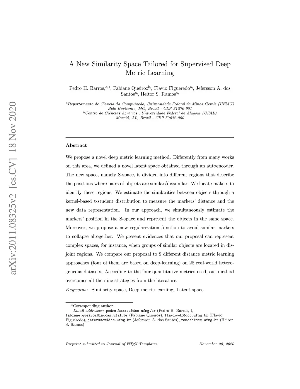 We propose a novel deep metric learning method. Differently from many works on this area, we defined a novel latent space obtained through an autoencoder. The new space, namely S-space, is divided into different regions that describe the positions where pairs of objects are similar/dissimilar. We locate makers to identify these regions. We estimate the similarities between objects through a kernel-based t-student distribution to measure the markers' distance and the new data representation. In our approach, we simultaneously estimate the markers' position in the S-space and represent the objects in the same space. Moreover, we propose a new regularization function to avoid similar markers to collapse altogether. We present evidences that our proposal can represent complex spaces, for instance, when groups of similar objects are located in disjoint regions. We compare our proposal to 9 different distance metric learning approaches (four of them are based on deep-learning) on 28 real-world heterogeneous datasets. According to the four quantitative metrics used, our method overcomes all the nine strategies from the literature.