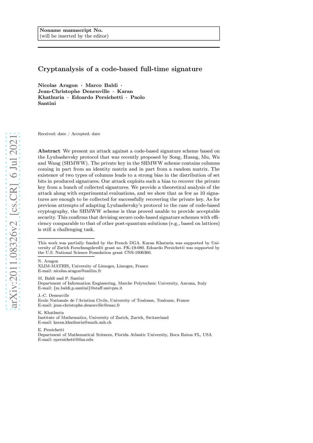 We present an attack against a code-based signature scheme based on the Lyubashevsky protocol that was recently proposed by Song, Huang, Mu, Wu and Wang (SHMWW). The private key in the SHMWW scheme contains columns coming in part from an identity matrix and in part from a random matrix. The existence of two types of columns leads to a strong bias in the distribution of set bits in produced signatures. Our attack exploits such a bias to recover the private key from a bunch of collected signatures. We provide a theoretical analysis of the attack along with experimental evaluations, and we show that as few as 10 signatures are enough to be collected for successfully recovering the private key. As for previous attempts of adapting Lyubashevsky's protocol to the case of code-based cryptography, the SHMWW scheme is thus proved unable to provide acceptable security. This confirms that devising secure code-based signature schemes with efficiency comparable to that of other post-quantum solutions (e.g., based on lattices) is still a challenging task.