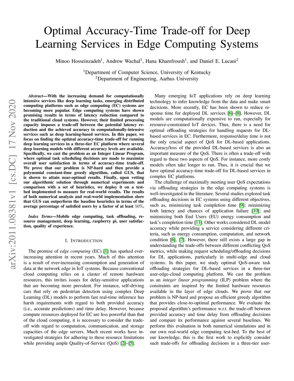 With the increasing demand for computationally intensive services like deep learning tasks, emerging distributed computing platforms such as edge computing (EC) systems are becoming more popular. Edge computing systems have shown promising results in terms of latency reduction compared to the traditional cloud systems. However, their limited processing capacity imposes a trade-off between the potential latency reduction and the achieved accuracy in computationally-intensive services such as deep learning-based services. In this paper, we focus on finding the optimal accuracy-time trade-off for running deep learning services in a three-tier EC platform where several deep learning models with different accuracy levels are available. Specifically, we cast the problem as an Integer Linear Program, where optimal task scheduling decisions are made to maximize overall user satisfaction in terms of accuracy-time trade-off. We prove that our problem is NP-hard and then provide a polynomial constant-time greedy algorithm, called GUS, that is shown to attain near-optimal results. Finally, upon vetting our algorithmic solution through numerical experiments and comparison with a set of heuristics, we deploy it on a test-bed implemented to measure for real-world results. The results of both numerical analysis and real-world implementation show that GUS can outperform the baseline heuristics in terms of the average percentage of satisfied users by a factor of at least 50%.
