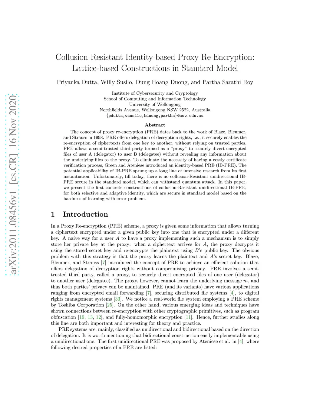 The concept of proxy re-encryption (PRE) dates back to the work of Blaze, Bleumer, and Strauss in 1998. PRE offers delegation of decryption rights, i.e., it securely enables the re-encryption of ciphertexts from one key to another, without relying on trusted parties. PRE allows a semi-trusted third party termed as a ``proxy" to securely divert encrypted files of user A (delegator) to user B (delegatee) without revealing any information about the underlying files to the proxy. To eliminate the necessity of having a costly certificate verification process, Green and Ateniese introduced an identity-based PRE (IB-PRE). The potential applicability of IB-PRE sprung up a long line of intensive research from its first instantiation. Unfortunately, till today, there is no collusion-Resistant unidirectional IB-PRE secure in the standard model, which can withstand quantum attack. In this paper, we present the first concrete constructions of collusion-Resistant unidirectional IB-PRE, for both selective and adaptive identity, which are secure in standard model based on the hardness of learning with error problem.