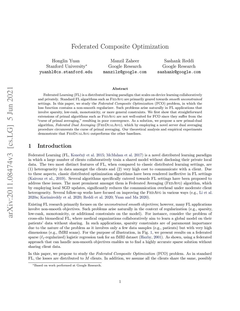 Federated Learning (FL) is a distributed learning paradigm that scales on-device learning collaboratively and privately. Standard FL algorithms such as FedAvg are primarily geared towards smooth unconstrained settings. In this paper, we study the Federated Composite Optimization (FCO) problem, in which the loss function contains a non-smooth regularizer. Such problems arise naturally in FL applications that involve sparsity, low-rank, monotonicity, or more general constraints. We first show that straightforward extensions of primal algorithms such as FedAvg are not well-suited for FCO since they suffer from the "curse of primal averaging," resulting in poor convergence. As a solution, we propose a new primal-dual algorithm, Federated Dual Averaging (FedDualAvg), which by employing a novel server dual averaging procedure circumvents the curse of primal averaging. Our theoretical analysis and empirical experiments demonstrate that FedDualAvg outperforms the other baselines.