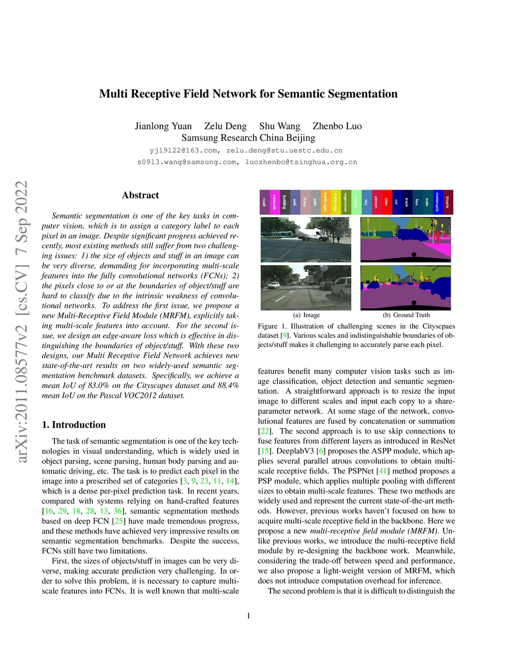 Semantic segmentation is one of the key tasks in computer vision, which is to assign a category label to each pixel in an image. Despite significant progress achieved recently, most existing methods still suffer from two challenging issues: 1) the size of objects and stuff in an image can be very diverse, demanding for incorporating multi-scale features into the fully convolutional networks (FCNs); 2) the pixels close to or at the boundaries of object/stuff are hard to classify due to the intrinsic weakness of convolutional networks. To address the first issue, we propose a new Multi-Receptive Field Module (MRFM), explicitly taking multi-scale features into account. For the second issue, we design an edge-aware loss which is effective in distinguishing the boundaries of object/stuff. With these two designs, our Multi Receptive Field Network achieves new state-of-the-art results on two widely-used semantic segmentation benchmark datasets. Specifically, we achieve a mean IoU of 83.0 on the Cityscapes dataset and 88.4 mean IoU on the Pascal VOC2012 dataset.