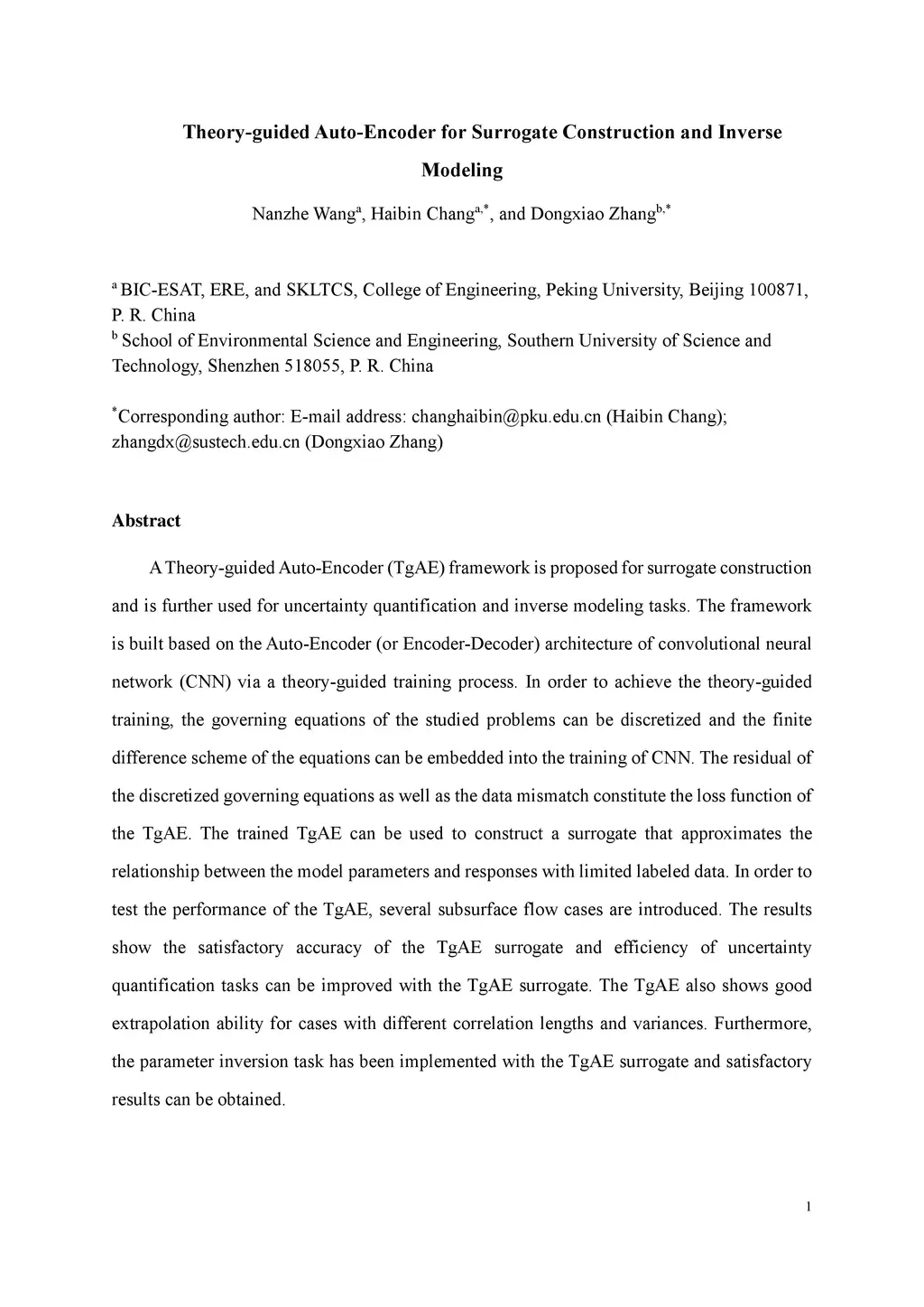 A Theory-guided Auto-Encoder (TgAE) framework is proposed for surrogate construction and is further used for uncertainty quantification and inverse modeling tasks. The framework is built based on the Auto-Encoder (or Encoder-Decoder) architecture of convolutional neural network (CNN) via a theory-guided training process. In order to achieve the theory-guided training, the governing equations of the studied problems can be discretized and the finite difference scheme of the equations can be embedded into the training of CNN. The residual of the discretized governing equations as well as the data mismatch constitute the loss function of the TgAE. The trained TgAE can be used to construct a surrogate that approximates the relationship between the model parameters and responses with limited labeled data. In order to test the performance of the TgAE, several subsurface flow cases are introduced. The results show the satisfactory accuracy of the TgAE surrogate and efficiency of uncertainty quantification tasks can be improved with the TgAE surrogate. The TgAE also shows good extrapolation ability for cases with different correlation lengths and variances. Furthermore, the parameter inversion task has been implemented with the TgAE surrogate and satisfactory results can be obtained.