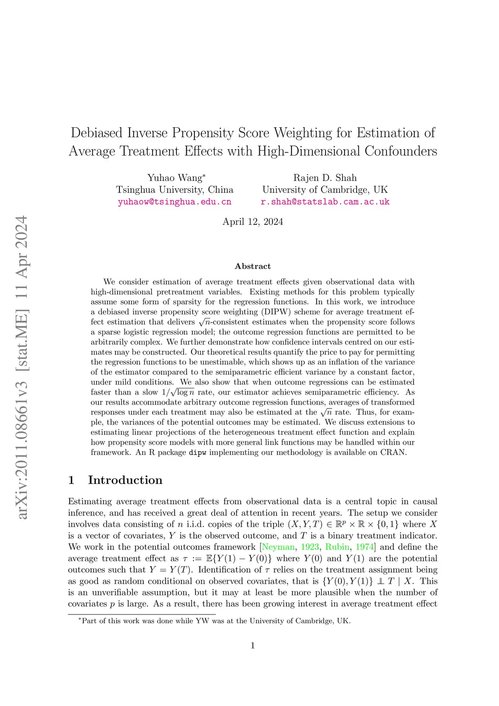 We consider estimation of average treatment effects given observational data with high-dimensional pretreatment variables. Existing methods for this problem typically assume some form of sparsity for the regression functions. In this work, we introduce a debiased inverse propensity score weighting (DIPW) scheme for average treatment effect estimation that delivers -consistent estimates when the propensity score follows a sparse logistic regression model; the outcome regression functions are permitted to be arbitrarily complex. We further demonstrate how confidence intervals centred on our estimates may be constructed. Our theoretical results quantify the price to pay for permitting the regression functions to be unestimable, which shows up as an inflation of the variance of the estimator compared to the semiparametric efficient variance by a constant factor, under mild conditions. We also show that when outcome regressions can be estimated faster than a slow rate, our estimator achieves semiparametric efficiency. As our results accommodate arbitrary outcome regression functions, averages of transformed responses under each treatment may also be estimated at the rate. Thus, for example, the variances of the potential outcomes may be estimated. We discuss extensions to estimating linear projections of the heterogeneous treatment effect function and explain how propensity score models with more general link functions may be handled within our framework. An R package \texttt{dipw} implementing our methodology is available on CRAN.