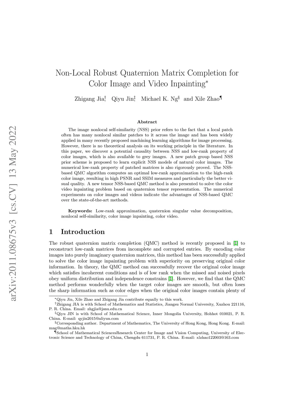 The image nonlocal self-similarity (NSS) prior refers to the fact that a local patch often has many nonlocal similar patches to it across the image and has been widely applied in many recently proposed machining learning algorithms for image processing. However, there is no theoretical analysis on its working principle in the literature. In this paper, we discover a potential causality between NSS and low-rank property of color images, which is also available to grey images. A new patch group based NSS prior scheme is proposed to learn explicit NSS models of natural color images. The numerical low-rank property of patched matrices is also rigorously proved. The NSS-based QMC algorithm computes an optimal low-rank approximation to the high-rank color image, resulting in high PSNR and SSIM measures and particularly the better visual quality. A new tensor NSS-based QMC method is also presented to solve the color video inpainting problem based on quaternion tensor representation. The numerical experiments on color images and videos indicate the advantages of NSS-based QMC over the state-of-the-art methods.