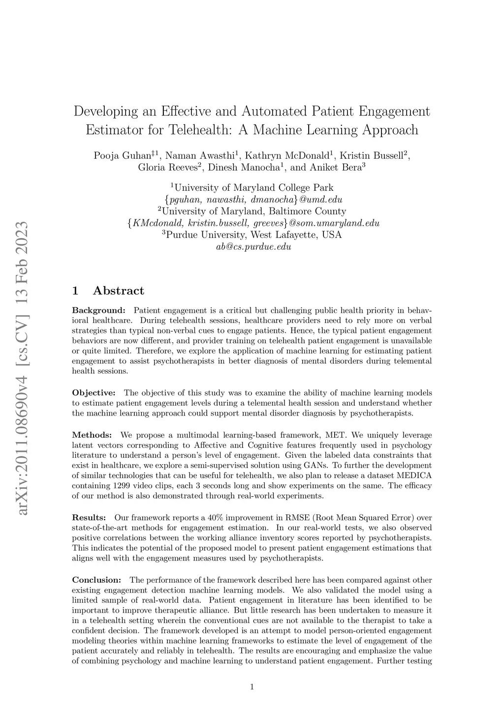 We discuss MET, a learning-based algorithm proposed for perceiving a patient's level of engagement during telehealth sessions. We leverage latent vectors corresponding to Affective and Cognitive features frequently used in psychology literature to understand a person's level of engagement in a semi-supervised GAN-based framework. We showcase the efficacy of this method from the perspective of mental health and more specifically how this can be leveraged for a better understanding of patient engagement during telemental health sessions. To further the development of similar technologies that can be useful for telehealth, we also plan to release a dataset MEDICA containing 1299 video clips, each 3 seconds long and show experiments on the same. Our framework reports a 40% improvement in RMSE (Root Mean Squared Error) over state-of-the-art methods for engagement estimation. In our real-world tests, we also observed positive correlations between the working alliance inventory scores reported by psychotherapists. This indicates the potential of the proposed model to present patient engagement estimations that aligns well with the engagement measures used by psychotherapists.
