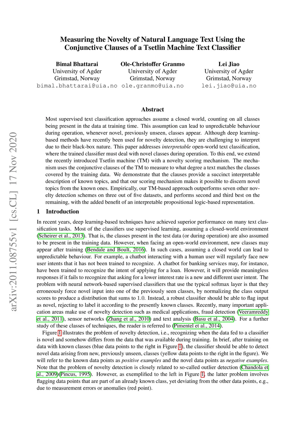 Most supervised text classification approaches assume a closed world, counting on all classes being present in the data at training time. This assumption can lead to unpredictable behaviour during operation, whenever novel, previously unseen, classes appear. Although deep learning-based methods have recently been used for novelty detection, they are challenging to interpret due to their black-box nature. This paper addresses \emph{interpretable} open-world text classification, where the trained classifier must deal with novel classes during operation. To this end, we extend the recently introduced Tsetlin machine (TM) with a novelty scoring mechanism. The mechanism uses the conjunctive clauses of the TM to measure to what degree a text matches the classes covered by the training data. We demonstrate that the clauses provide a succinct interpretable description of known topics, and that our scoring mechanism makes it possible to discern novel topics from the known ones. Empirically, our TM-based approach outperforms seven other novelty detection schemes on three out of five datasets, and performs second and third best on the remaining, with the added benefit of an interpretable propositional logic-based representation.