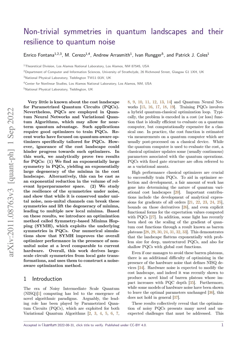 Very little is known about the cost landscape for parametrized Quantum Circuits (PQCs). Nevertheless, PQCs are employed in Quantum Neural Networks and Variational Quantum Algorithms, which may allow for near-term quantum advantage. Such applications require good optimizers to train PQCs. Recent works have focused on quantum-aware optimizers specifically tailored for PQCs. However, ignorance of the cost landscape could hinder progress towards such optimizers. In this work, we analytically prove two results for PQCs: (1) We find an exponentially large symmetry in PQCs, yielding an exponentially large degeneracy of the minima in the cost landscape. Alternatively, this can be cast as an exponential reduction in the volume of relevant hyperparameter space. (2) We study the resilience of the symmetries under noise, and show that while it is conserved under unital noise, non-unital channels can break these symmetries and lift the degeneracy of minima, leading to multiple new local minima. Based on these results, we introduce an optimization method called Symmetry-based Minima Hopping (SYMH), which exploits the underlying symmetries in PQCs. Our numerical simulations show that SYMH improves the overall optimizer performance in the presence of non-unital noise at a level comparable to current hardware. Overall, this work derives large-scale circuit symmetries from local gate transformations, and uses them to construct a noise-aware optimization method.