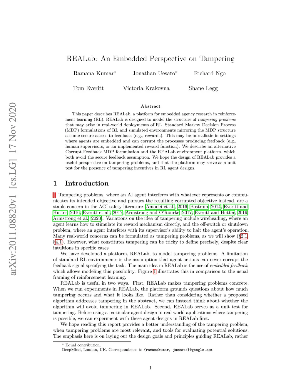 This paper describes REALab, a platform for embedded agency research in reinforcement learning (RL). REALab is designed to model the structure of tampering problems that may arise in real-world deployments of RL. Standard Markov Decision Process (MDP) formulations of RL and simulated environments mirroring the MDP structure assume secure access to feedback (e.g., rewards). This may be unrealistic in settings where agents are embedded and can corrupt the processes producing feedback (e.g., human supervisors, or an implemented reward function). We describe an alternative Corrupt Feedback MDP formulation and the REALab environment platform, which both avoid the secure feedback assumption. We hope the design of REALab provides a useful perspective on tampering problems, and that the platform may serve as a unit test for the presence of tampering incentives in RL agent designs.