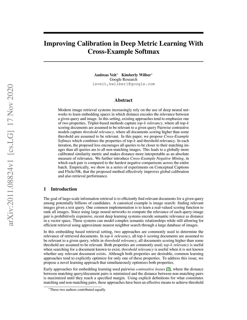 Modern image retrieval systems increasingly rely on the use of deep neural networks to learn embedding spaces in which distance encodes the relevance between a given query and image. In this setting, existing approaches tend to emphasize one of two properties. Triplet-based methods capture top- relevancy, where all top- scoring documents are assumed to be relevant to a given query Pairwise contrastive models capture threshold relevancy, where all documents scoring higher than some threshold are assumed to be relevant. In this paper, we propose Cross-Example Softmax which combines the properties of top- and threshold relevancy. In each iteration, the proposed loss encourages all queries to be closer to their matching images than all queries are to all non-matching images. This leads to a globally more calibrated similarity metric and makes distance more interpretable as an absolute measure of relevance. We further introduce Cross-Example Negative Mining, in which each pair is compared to the hardest negative comparisons across the entire batch. Empirically, we show in a series of experiments on Conceptual Captions and Flickr30k, that the proposed method effectively improves global calibration and also retrieval performance.