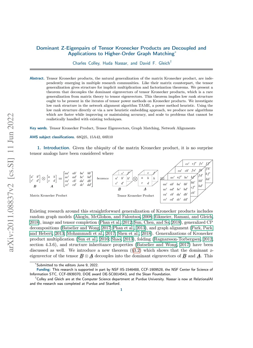Tensor Kronecker products, the natural generalization of the matrix Kronecker product, are independently emerging in multiple research communities. Like their matrix counterpart, the tensor generalization gives structure for implicit multiplication and factorization theorems. We present a theorem that decouples the dominant eigenvectors of tensor Kronecker products, which is a rare generalization from matrix theory to tensor eigenvectors. This theorem implies low rank structure ought to be present in the iterates of tensor power methods on Kronecker products. We investigate low rank structure in the network alignment algorithm TAME, a power method heuristic. Using the low rank structure directly or via a new heuristic embedding approach, we produce new algorithms which are faster while improving or maintaining accuracy, and scale to problems that cannot be realistically handled with existing techniques.