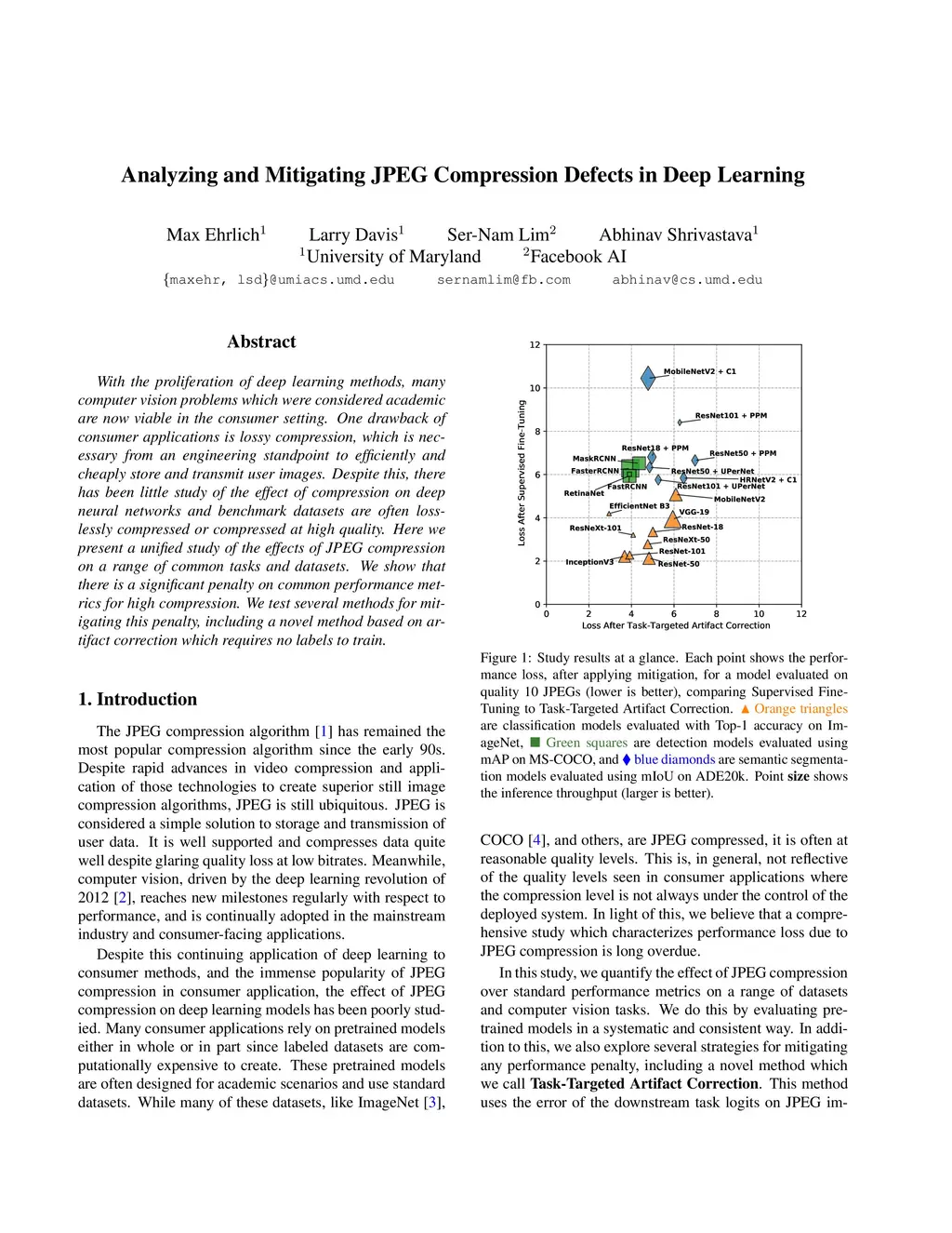 With the proliferation of deep learning methods, many computer vision problems which were considered academic are now viable in the consumer setting. One drawback of consumer applications is lossy compression, which is necessary from an engineering standpoint to efficiently and cheaply store and transmit user images. Despite this, there has been little study of the effect of compression on deep neural networks and benchmark datasets are often losslessly compressed or compressed at high quality. Here we present a unified study of the effects of JPEG compression on a range of common tasks and datasets. We show that there is a significant penalty on common performance metrics for high compression. We test several methods for mitigating this penalty, including a novel method based on artifact correction which requires no labels to train.