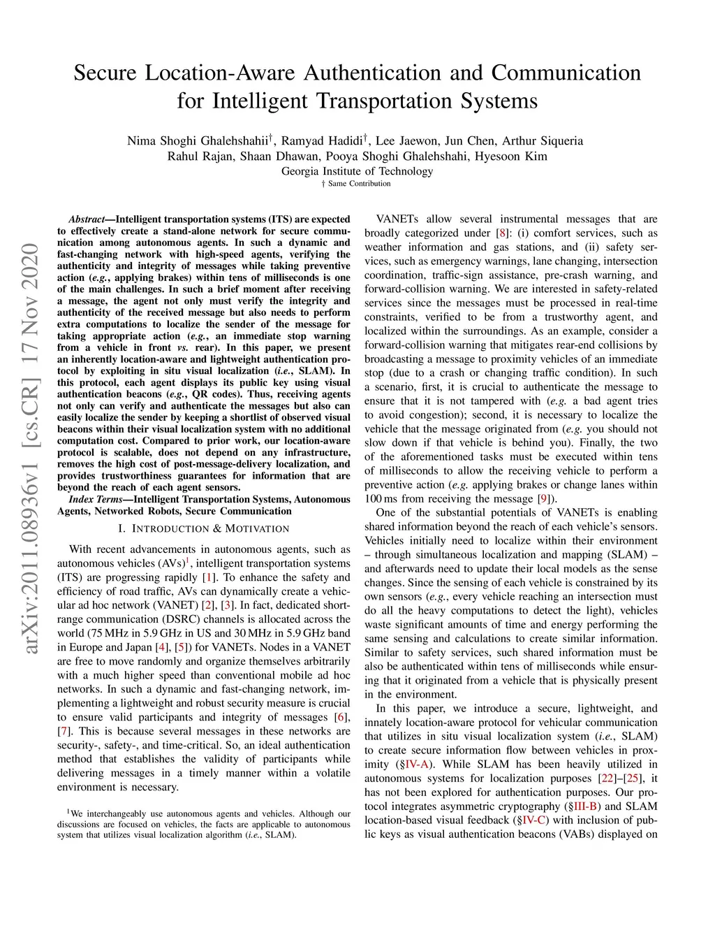 Intelligent transportation systems (ITS) are expected to effectively create a stand-alone network for secure communication among autonomous agents. In such a dynamic and fast-changing network with high-speed agents, verifying the authenticity and integrity of messages while taking preventive action (e.g., applying brakes) within tens of milliseconds is one of the main challenges. In such a brief moment after receiving a message, the agent not only must verify the integrity and authenticity of the received message but also needs to perform extra computations to localize the sender of the message for taking appropriate action (e.g., an immediate stop warning from a vehicle in front vs. rear). In this paper, we present an inherently location-aware and lightweight authentication protocol by exploiting in situ visual localization (i.e., SLAM). In this protocol, each agent displays its public key using visual authentication beacons (e.g., QR codes). Thus, receiving agents not only can verify and authenticate the messages but also can easily localize the sender by keeping a shortlist of observed visual beacons within their visual localization system with no additional computation cost. Compared to prior work, our location-aware protocol is scalable, does not depend on any infrastructure, removes the high cost of post-message-delivery localization, and provides trustworthiness guarantees for information that are beyond the reach of each agent sensors.
