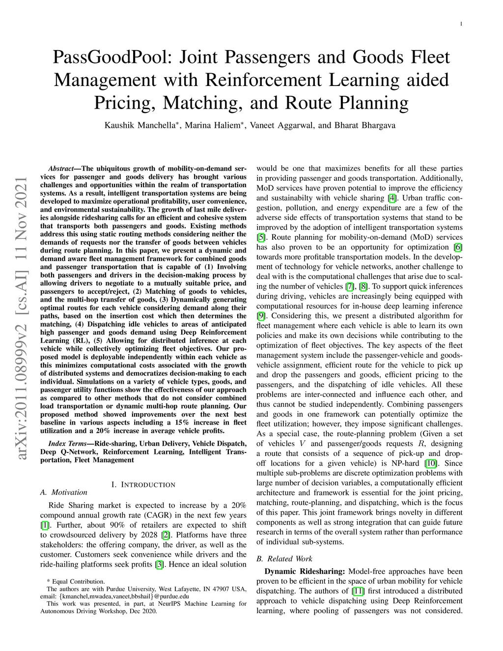 In this paper, we present a dynamic, demand aware, and pricing-based matching and route planning framework that allows efficient pooling of multiple passengers and goods in each vehicle. This approach includes the flexibility for transferring goods through multiple hops from source to destination as well as pooling of passengers. The key components of the proposed approach include (i) Pricing by the vehicles to passengers which is based on the insertion cost, which determines the matching based on passenger's acceptance/rejection, (ii) Matching of goods to vehicles, and the multi-hop routing of goods, (iii) Route planning of the vehicles to pick. up and drop passengers and goods, (i) Dispatching idle vehicles to areas of anticipated high passenger and goods demand using Deep Reinforcement Learning, and (v) Allowing for distributed inference at each vehicle while collectively optimizing fleet objectives. Our proposed framework can be deployed independently within each vehicle as this minimizes computational costs associated with the gorwth of distributed systems and democratizes decision-making to each individual. The proposed framework is validated in a simulated environment, where we leverage realistic delivery datasets such as the New York City Taxi public dataset and Google Maps traffic data from delivery offering businesses.Simulations on a variety of vehicle types, goods, and passenger utility functions show the effectiveness of our approach as compared to baselines that do not consider combined load transportation or dynamic multi-hop route planning. Our proposed method showed improvements over the next best baseline in various aspects including a 15% increase in fleet utilization and 20% increase in average vehicle profits.