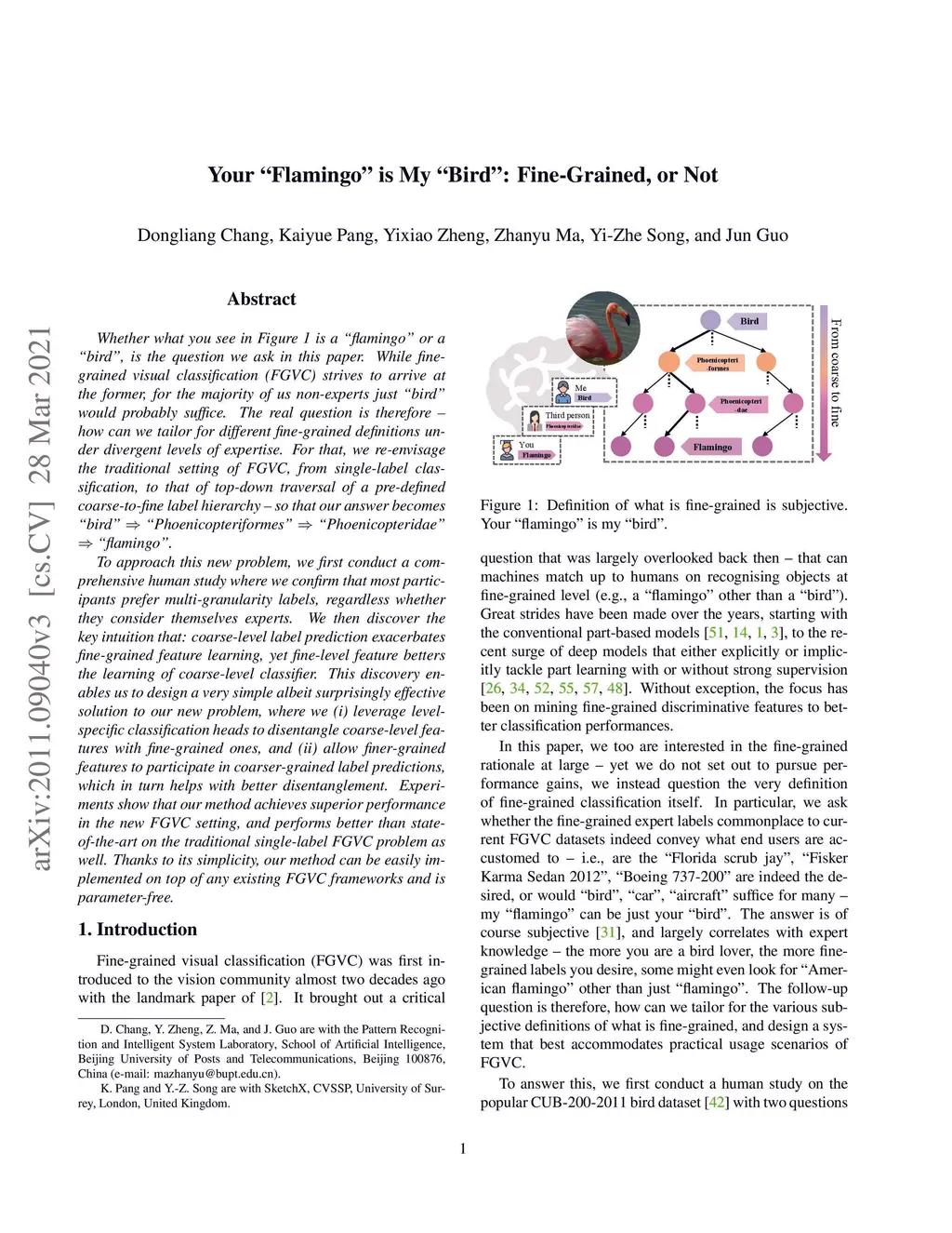 Whether what you see in Figure 1 is a "flamingo" or a "bird", is the question we ask in this paper. While fine-grained visual classification (FGVC) strives to arrive at the former, for the majority of us non-experts just "bird" would probably suffice. The real question is therefore -- how can we tailor for different fine-grained definitions under divergent levels of expertise. For that, we re-envisage the traditional setting of FGVC, from single-label classification, to that of top-down traversal of a pre-defined coarse-to-fine label hierarchy -- so that our answer becomes "bird"-->"Phoenicopteriformes"-->"Phoenicopteridae"-->"flamingo". To approach this new problem, we first conduct a comprehensive human study where we confirm that most participants prefer multi-granularity labels, regardless whether they consider themselves experts. We then discover the key intuition that: coarse-level label prediction exacerbates fine-grained feature learning, yet fine-level feature betters the learning of coarse-level classifier. This discovery enables us to design a very simple albeit surprisingly effective solution to our new problem, where we (i) leverage level-specific classification heads to disentangle coarse-level features with fine-grained ones, and (ii) allow finer-grained features to participate in coarser-grained label predictions, which in turn helps with better disentanglement. Experiments show that our method achieves superior performance in the new FGVC setting, and performs better than state-of-the-art on traditional single-label FGVC problem as well. Thanks to its simplicity, our method can be easily implemented on top of any existing FGVC frameworks and is parameter-free.