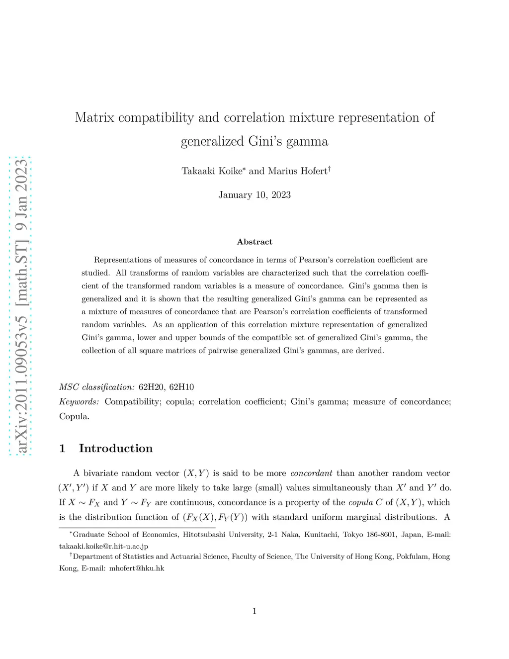 Representations of measures of concordance in terms of Pearson' s correlation coefficient are studied. All transforms of random variables are characterized such that the correlation coefficient of the transformed random variables is a measure of concordance. Next, Gini' s gamma is generalized and it is shown that the resulting generalized Gini' s gamma can be represented as a mixture of measures of concordance that are Pearson' s correlation coefficients of transformed random variables. As an application of this correlation mixture representation of generalized Gini' s gamma, lower and upper bounds of the compatible set of generalized Gini' s gamma, which is the collection of all possible square matrices whose entries are pairwise bivariate generalized Gini' s gammas, are derived.