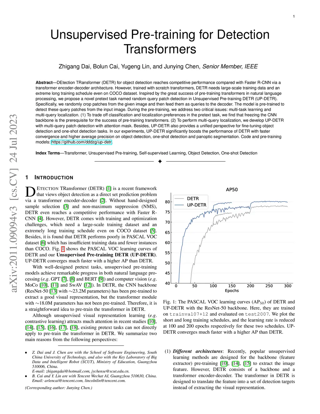 UP-DETR: Unsupervised Pre-training for Object Detection with