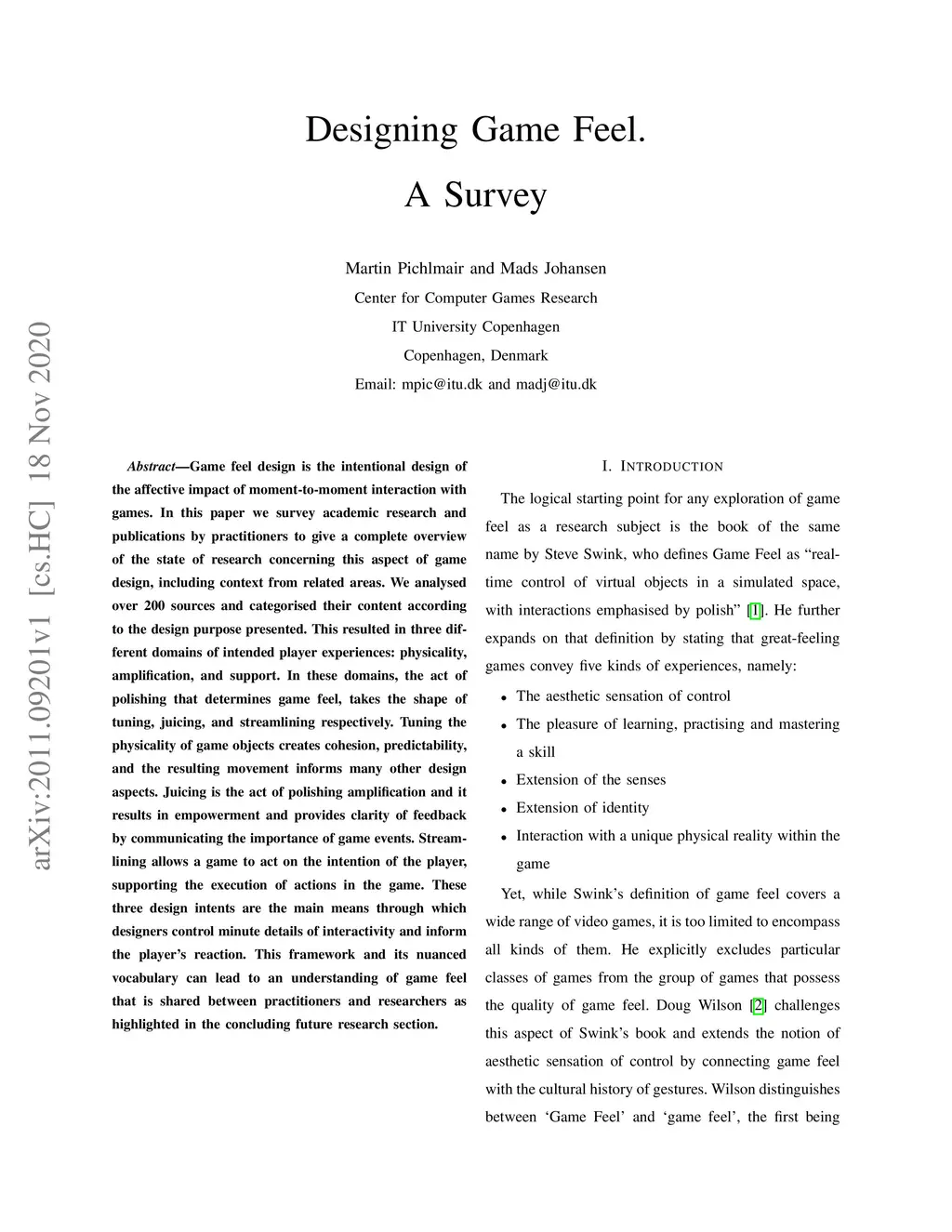 Designing Game Feel. A Survey