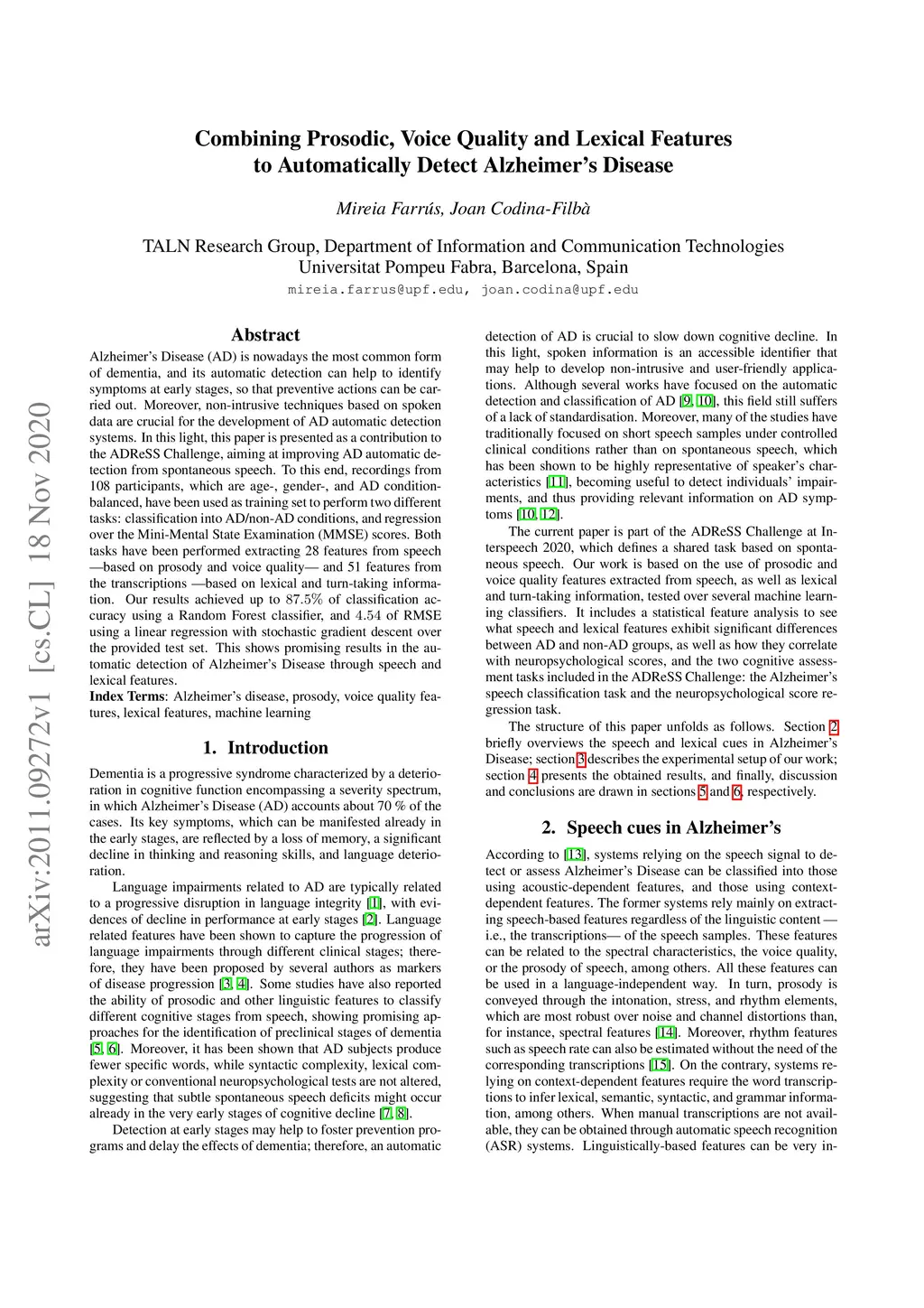 Alzheimer's Disease (AD) is nowadays the most common form of dementia, and its automatic detection can help to identify symptoms at early stages, so that preventive actions can be carried out. Moreover, non-intrusive techniques based on spoken data are crucial for the development of AD automatic detection systems. In this light, this paper is presented as a contribution to the ADReSS Challenge, aiming at improving AD automatic detection from spontaneous speech. To this end, recordings from 108 participants, which are age-, gender-, and AD condition-balanced, have been used as training set to perform two different tasks: classification into AD/non-AD conditions, and regression over the Mini-Mental State Examination (MMSE) scores. Both tasks have been performed extracting 28 features from speech -- based on prosody and voice quality -- and 51 features from the transcriptions -- based on lexical and turn-taking information. Our results achieved up to 87.5 % of classification accuracy using a Random Forest classifier, and 4.54 of RMSE using a linear regression with stochastic gradient descent over the provided test set. This shows promising results in the automatic detection of Alzheimer's Disease through speech and lexical features.
