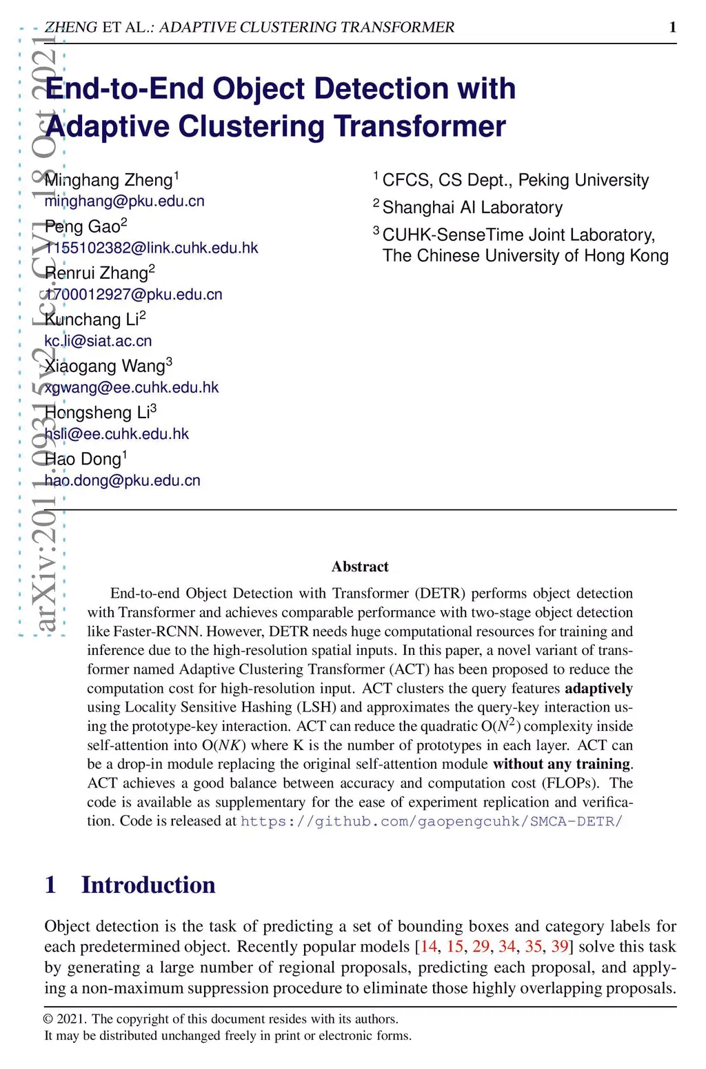 End-to-end Object Detection with Transformer (DETR)proposes to perform object detection with Transformer and achieve comparable performance with two-stage object detection like Faster-RCNN. However, DETR needs huge computational resources for training and inference due to the high-resolution spatial input. In this paper, a novel variant of transformer named Adaptive Clustering Transformer(ACT) has been proposed to reduce the computation cost for high-resolution input. ACT cluster the query features adaptively using Locality Sensitive Hashing (LSH) and ap-proximate the query-key interaction using the prototype-key interaction. ACT can reduce the quadratic O(N2) complexity inside self-attention into O(NK) where K is the number of prototypes in each layer. ACT can be a drop-in module replacing the original self-attention module without any training. ACT achieves a good balance between accuracy and computation cost (FLOPs). The code is available as supplementary for the ease of experiment replication and verification. Code is released at \url{https://github.com/gaopengcuhk/SMCA-DETR/}