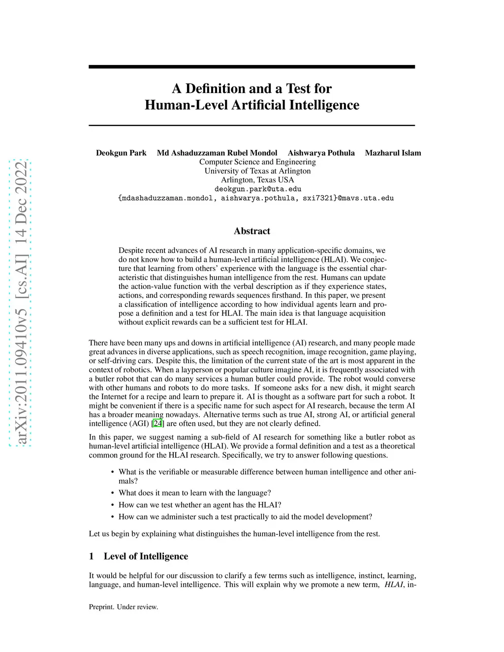 Despite recent advances in many application-specific domains, we do not know how to build a human-level artificial intelligence (HLAI). We conjecture that learning from others' experience with the language is the essential characteristic that distinguishes human intelligence from the rest. Humans can update the action-value function with the verbal description as if they experience states, actions, and corresponding rewards sequences firsthand. In this paper, we present a classification of intelligence according to how individual agents learn and propose a definition and a test for HLAI. The main idea is that language acquisition without explicit rewards can be a sufficient test for HLAI.