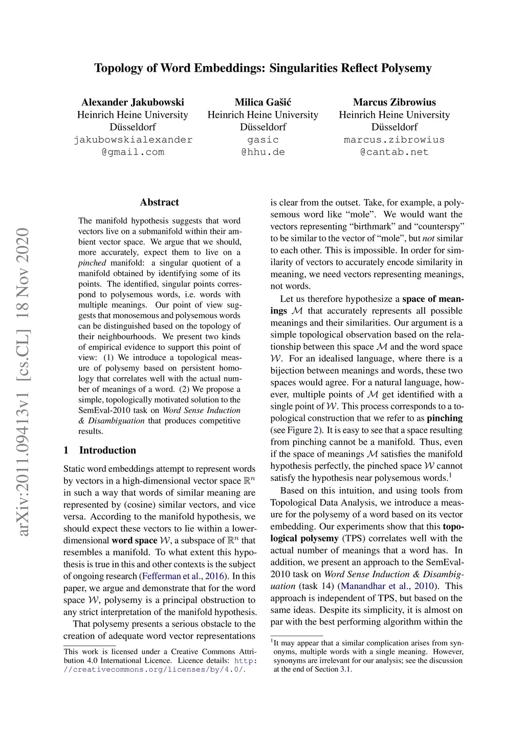 The manifold hypothesis suggests that word vectors live on a submanifold within their ambient vector space. We argue that we should, more accurately, expect them to live on a pinched manifold: a singular quotient of a manifold obtained by identifying some of its points. The identified, singular points correspond to polysemous words, i.e. words with multiple meanings. Our point of view suggests that monosemous and polysemous words can be distinguished based on the topology of their neighbourhoods. We present two kinds of empirical evidence to support this point of view: (1) We introduce a topological measure of polysemy based on persistent homology that correlates well with the actual number of meanings of a word. (2) We propose a simple, topologically motivated solution to the SemEval-2010 task on Word Sense Induction & Disambiguation that produces competitive results.