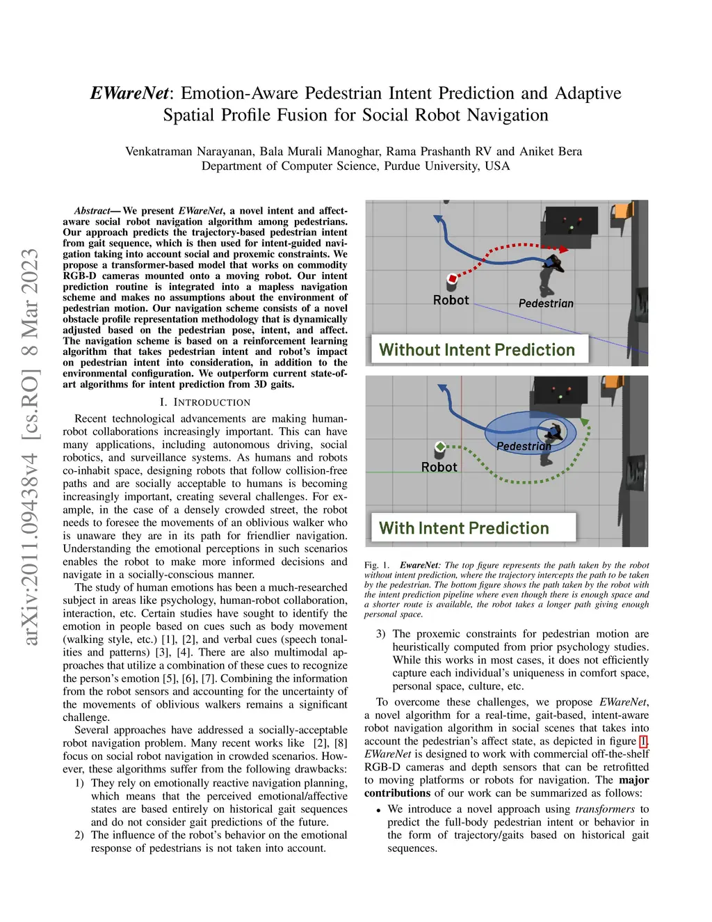 We present EWareNet, a novel intent-aware social robot navigation algorithm among pedestrians. Our approach predicts the trajectory-based pedestrian intent from historical gaits, which is then used for intent-guided navigation taking into account social and proxemic constraints. To predict pedestrian intent, we propose a transformer-based model that works on a commodity RGB-D camera mounted onto a moving robot. Our intent prediction routine is integrated into a mapless navigation scheme and makes no assumptions about the environment of pedestrian motion. Our navigation scheme consists of a novel obstacle profile representation methodology that is dynamically adjusted based on the pedestrian pose, intent, and emotion. The navigation scheme is based on a reinforcement learning algorithm that takes into consideration human intent and robot's impact on human intent, in addition to the environmental configuration. We outperform current state-of-art algorithms for intent prediction from 3D gaits.