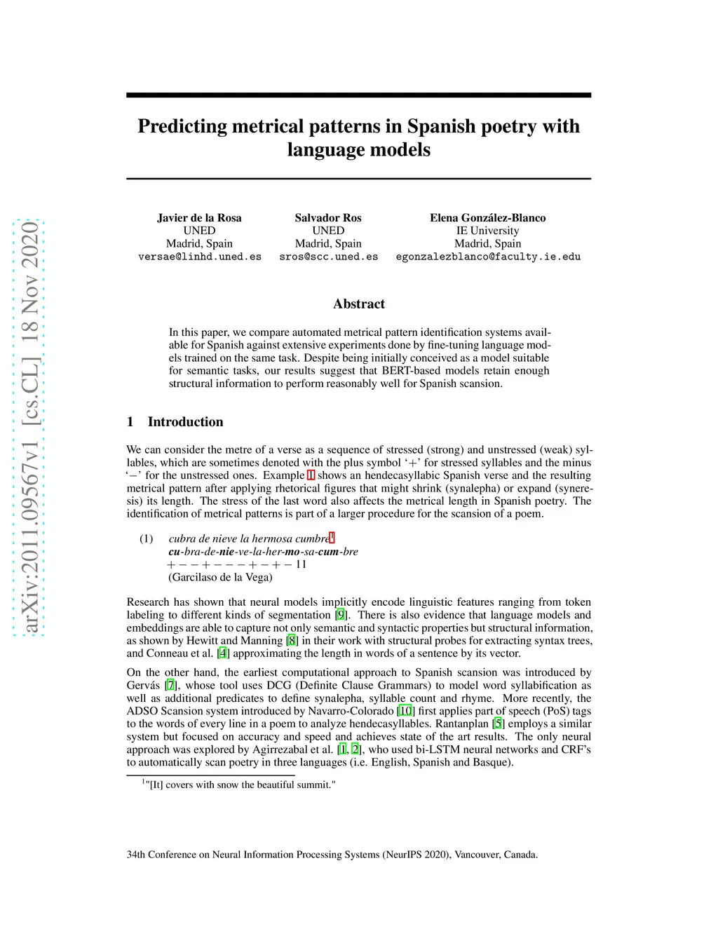 In this paper, we compare automated metrical pattern identification systems available for Spanish against extensive experiments done by fine-tuning language models trained on the same task. Despite being initially conceived as a model suitable for semantic tasks, our results suggest that BERT-based models retain enough structural information to perform reasonably well for Spanish scansion.