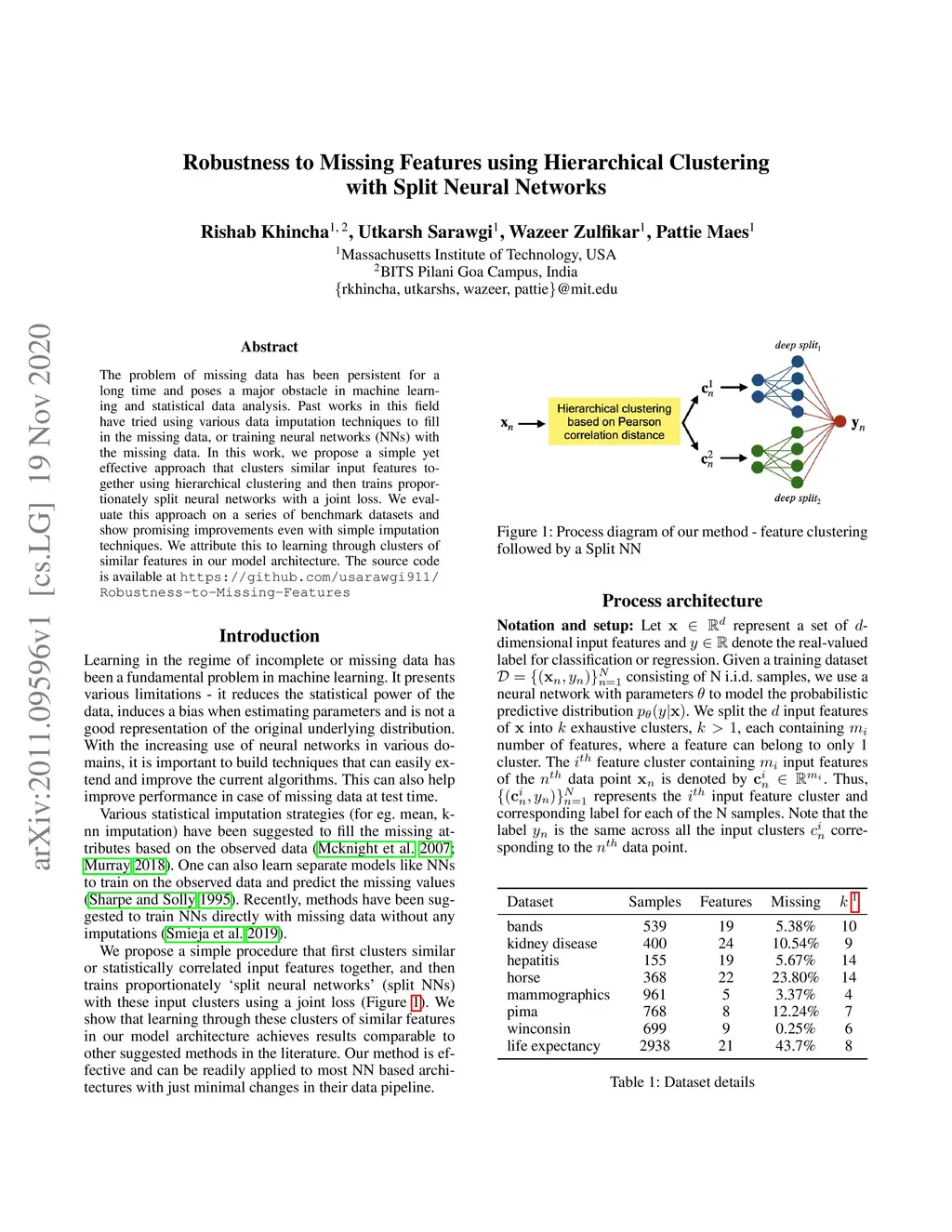 The problem of missing data has been persistent for a long time and poses a major obstacle in machine learning and statistical data analysis. Past works in this field have tried using various data imputation techniques to fill in the missing data, or training neural networks (NNs) with the missing data. In this work, we propose a simple yet effective approach that clusters similar input features together using hierarchical clustering and then trains proportionately split neural networks with a joint loss. We evaluate this approach on a series of benchmark datasets and show promising improvements even with simple imputation techniques. We attribute this to learning through clusters of similar features in our model architecture. The source code is available at https://github.com/usarawgi911/Robustness-to-Missing-Features