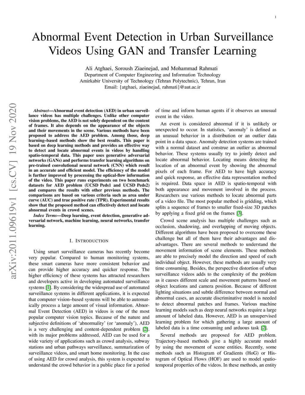 Abnormal event detection (AED) in urban surveillance videos has multiple challenges. Unlike other computer vision problems, the AED is not solely dependent on the content of frames. It also depends on the appearance of the objects and their movements in the scene. Various methods have been proposed to address the AED problem. Among those, deep learning based methods show the best results. This paper is based on deep learning methods and provides an effective way to detect and locate abnormal events in videos by handling spatio temporal data. This paper uses generative adversarial networks (GANs) and performs transfer learning algorithms on pre trained convolutional neural network (CNN) which result in an accurate and efficient model. The efficiency of the model is further improved by processing the optical flow information of the video. This paper runs experiments on two benchmark datasets for AED problem (UCSD Peds1 and UCSD Peds2) and compares the results with other previous methods. The comparisons are based on various criteria such as area under curve (AUC) and true positive rate (TPR). Experimental results show that the proposed method can effectively detect and locate abnormal events in crowd scenes.