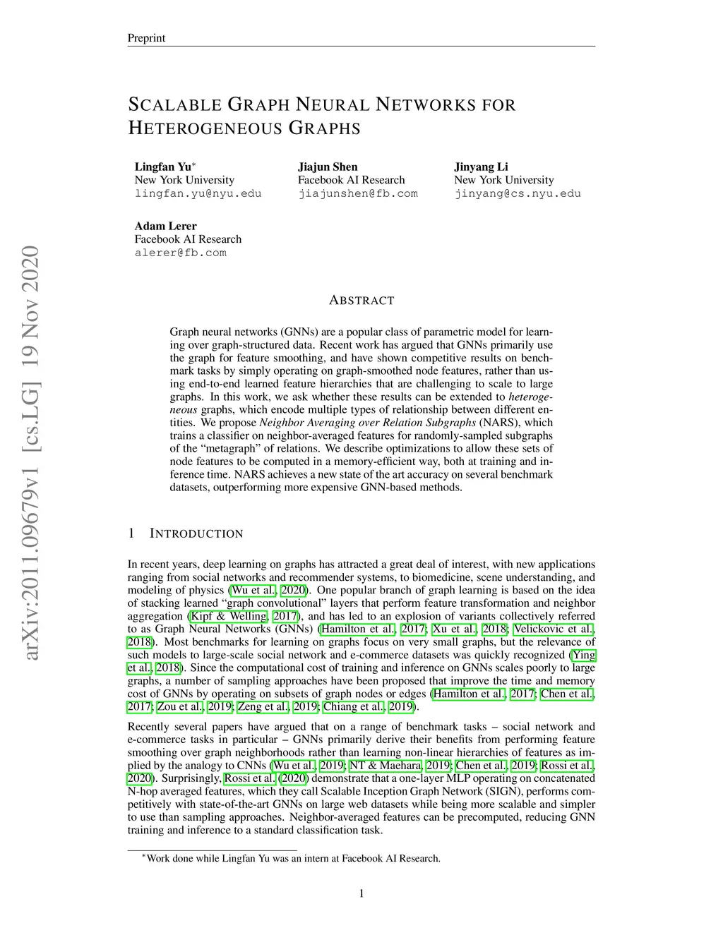 Graph neural networks (GNNs) are a popular class of parametric model for learning over graph-structured data. Recent work has argued that GNNs primarily use the graph for feature smoothing, and have shown competitive results on benchmark tasks by simply operating on graph-smoothed node features, rather than using end-to-end learned feature hierarchies that are challenging to scale to large graphs. In this work, we ask whether these results can be extended to heterogeneous graphs, which encode multiple types of relationship between different entities. We propose Neighbor Averaging over Relation Subgraphs (NARS), which trains a classifier on neighbor-averaged features for randomly-sampled subgraphs of the "metagraph" of relations. We describe optimizations to allow these sets of node features to be computed in a memory-efficient way, both at training and inference time. NARS achieves a new state of the art accuracy on several benchmark datasets, outperforming more expensive GNN-based methods