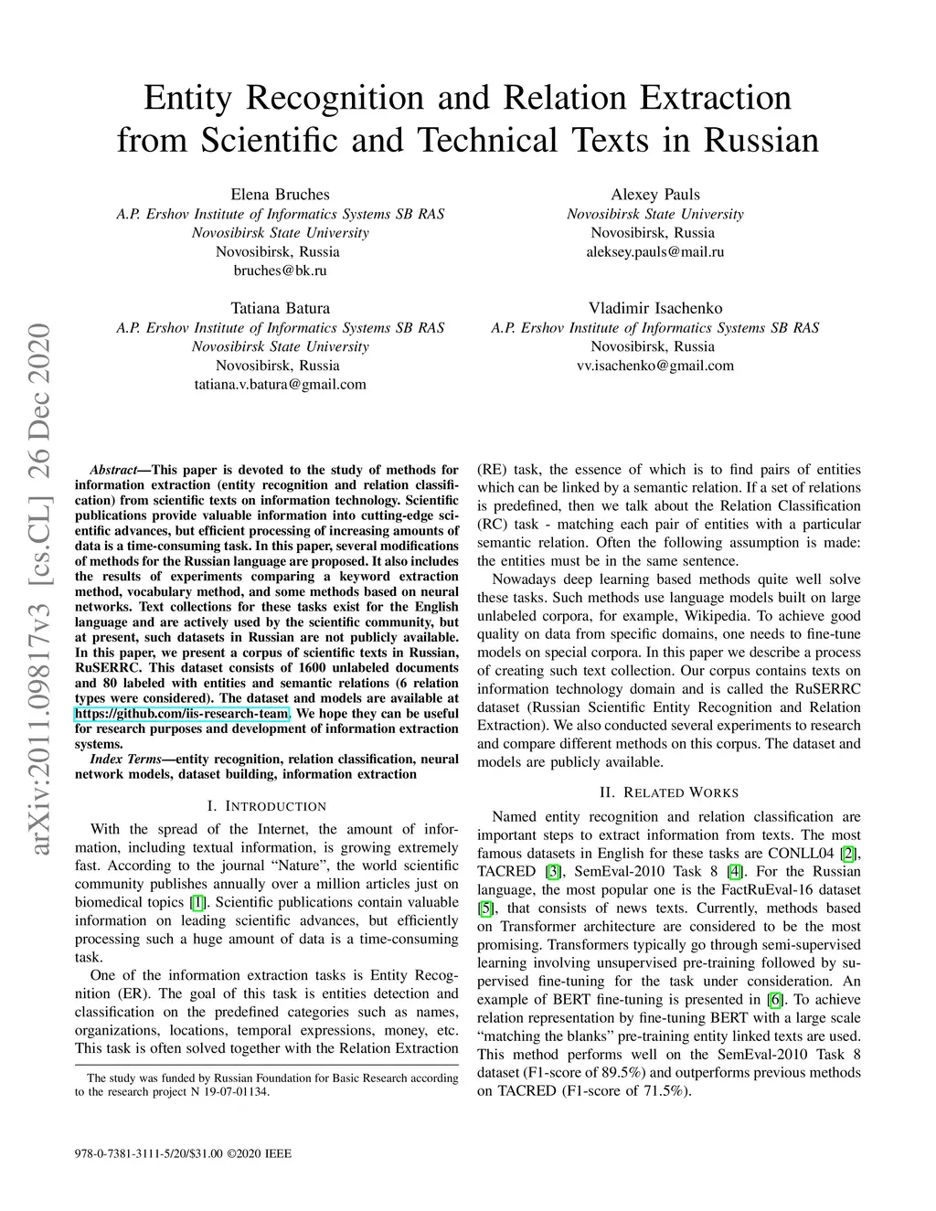 This paper is devoted to the study of methods for information extraction (entity recognition and relation classification) from scientific texts on information technology. Scientific publications provide valuable information into cutting-edge scientific advances, but efficient processing of increasing amounts of data is a time-consuming task. In this paper, several modifications of methods for the Russian language are proposed. It also includes the results of experiments comparing a keyword extraction method, vocabulary method, and some methods based on neural networks. Text collections for these tasks exist for the English language and are actively used by the scientific community, but at present, such datasets in Russian are not publicly available. In this paper, we present a corpus of scientific texts in Russian, RuSERRC. This dataset consists of 1600 unlabeled documents and 80 labeled with entities and semantic relations (6 relation types were considered). The dataset and models are available at https://github.com/iis-research-team. We hope they can be useful for research purposes and development of information extraction systems.